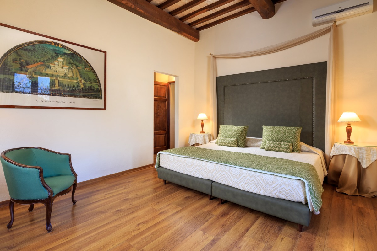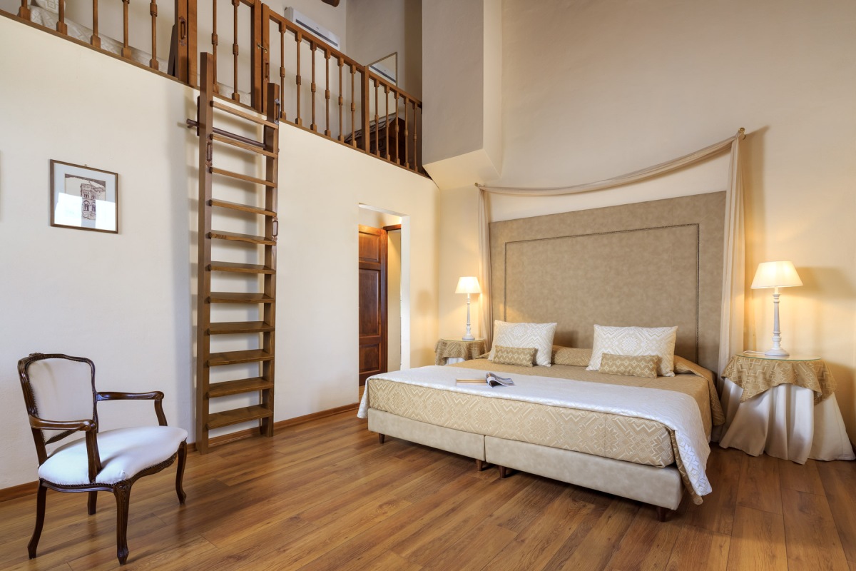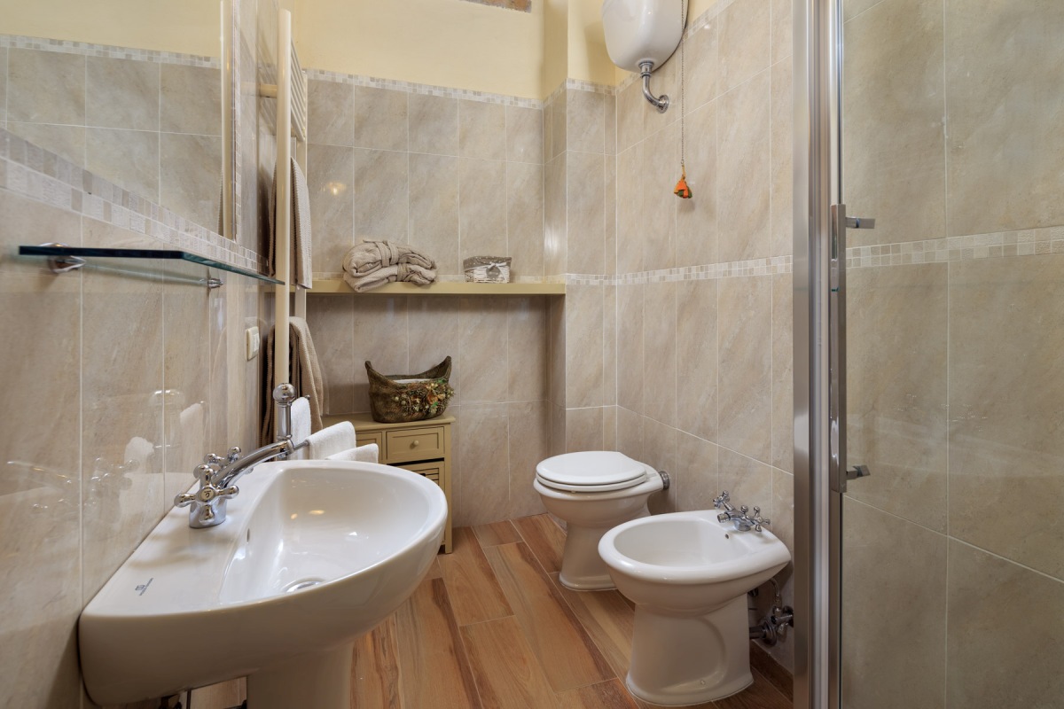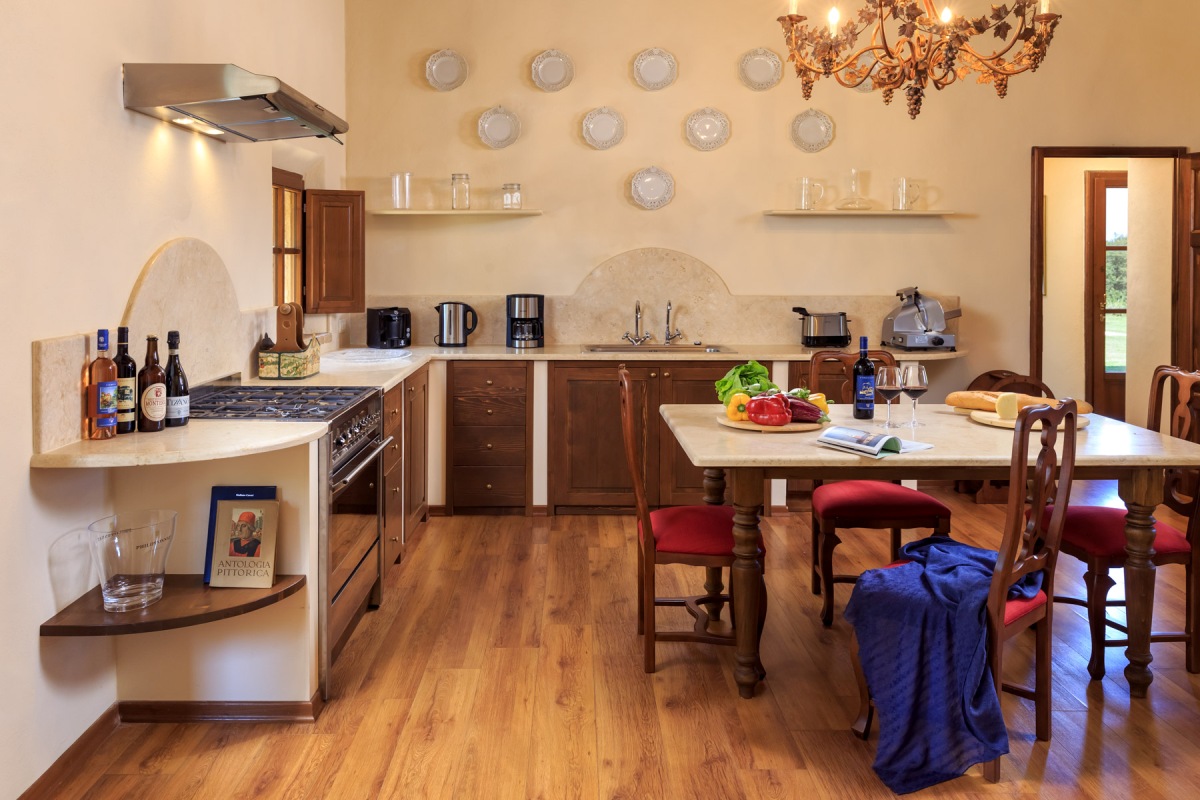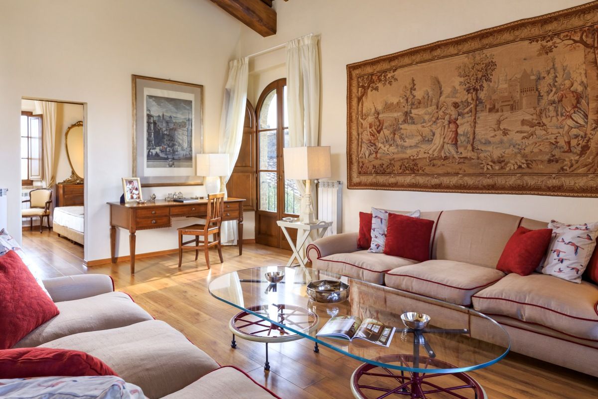 Accessed by an elegant wooden staircase, the first floor houses two spacious double bedrooms featuring en-suite bathroom with shower and a comfortable sofa bed, which is available on request, on a mezzanine level. On the same floor, which is also accessed by an external stone staircase, you will also find two spacious and light-filled living areas furnished with comfortable sofas and elegant armchairs offering plenty of seating: as the evening falls, sit around the fireplace and relax while enjoying a glass of Brunello with your fellow guests.