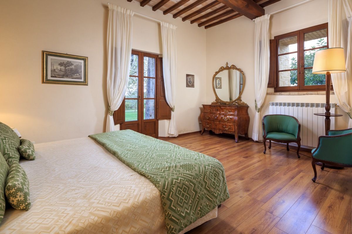 On the ground floor of the villa, wooden floors, high beamed ceilings and large windows create voluminous spaces while giving a warm and traditional look to the dining room. The ground floor also houses a spacious fully-equipped kitchen which includes a large table under a timber ceiling where guests can enjoy their breakfast, while large windows offer inviting views over the garden, creating a luminous atmosphere dominated by light colors. On the same floor you will also find two elegant double bedrooms featuring en-suite bathroom with shower and plenty of natural light, providing a lovely haven for peaceful nights.