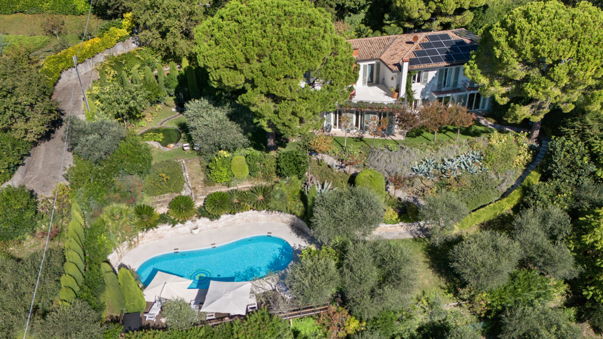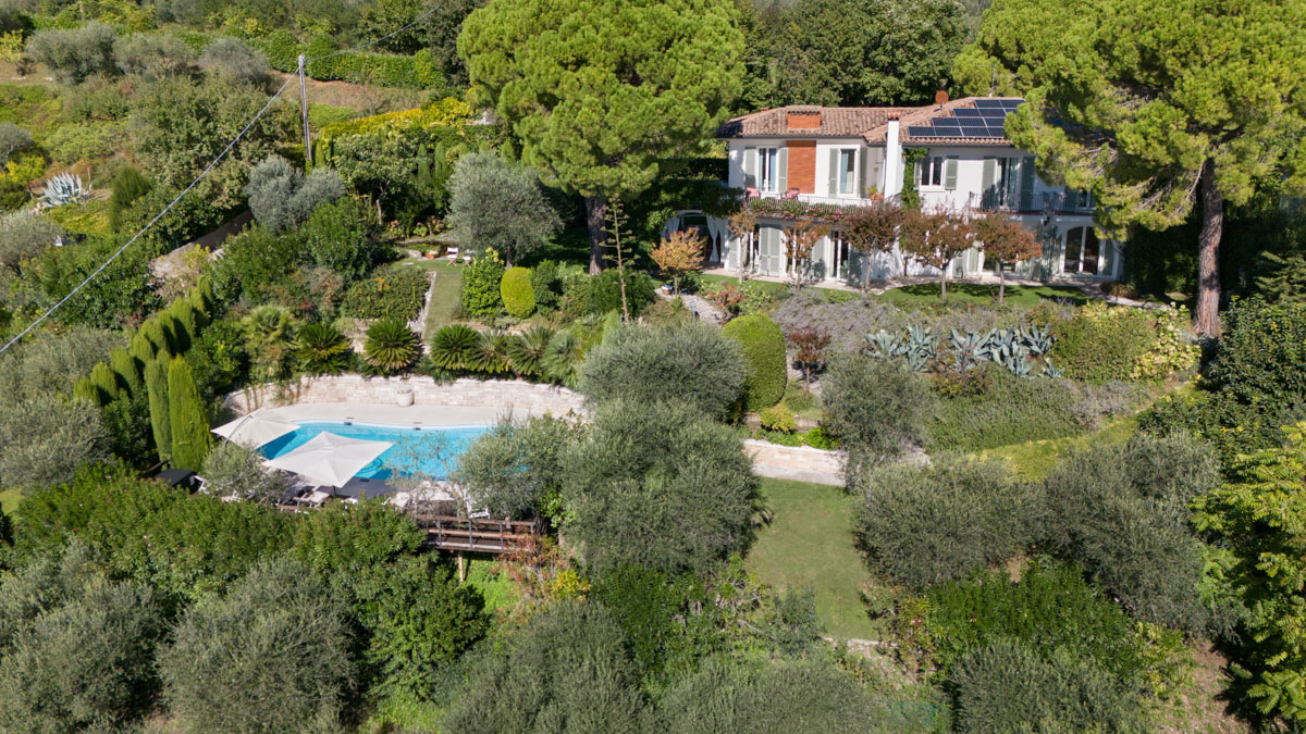 Surrounded by a lush garden, the villa is a haven of peace where ancient trees and fragrant flowers create an idyllic atmosphere. At the heart of this verdant oasis lies a swimming pool, offering a serene space to unwind. The garden also features a shaded dining area under a charming patio with white drapes adorning its arches, perfect for al fresco meals. A picturesque pond and a staircase lead to the paved poolside terrace with sun loungers, where guests can enjoy breathtaking views.