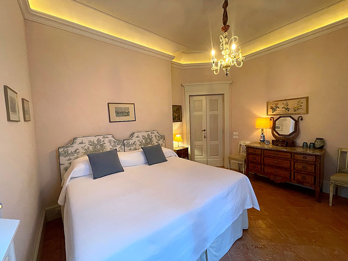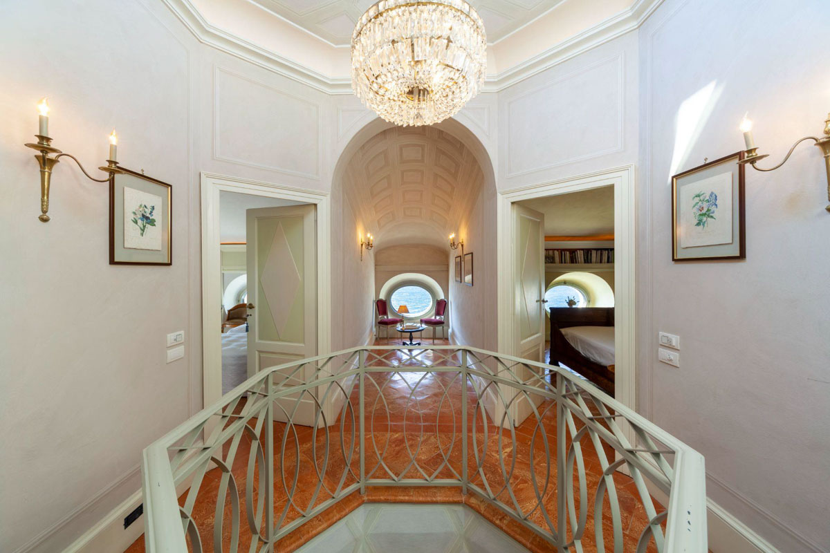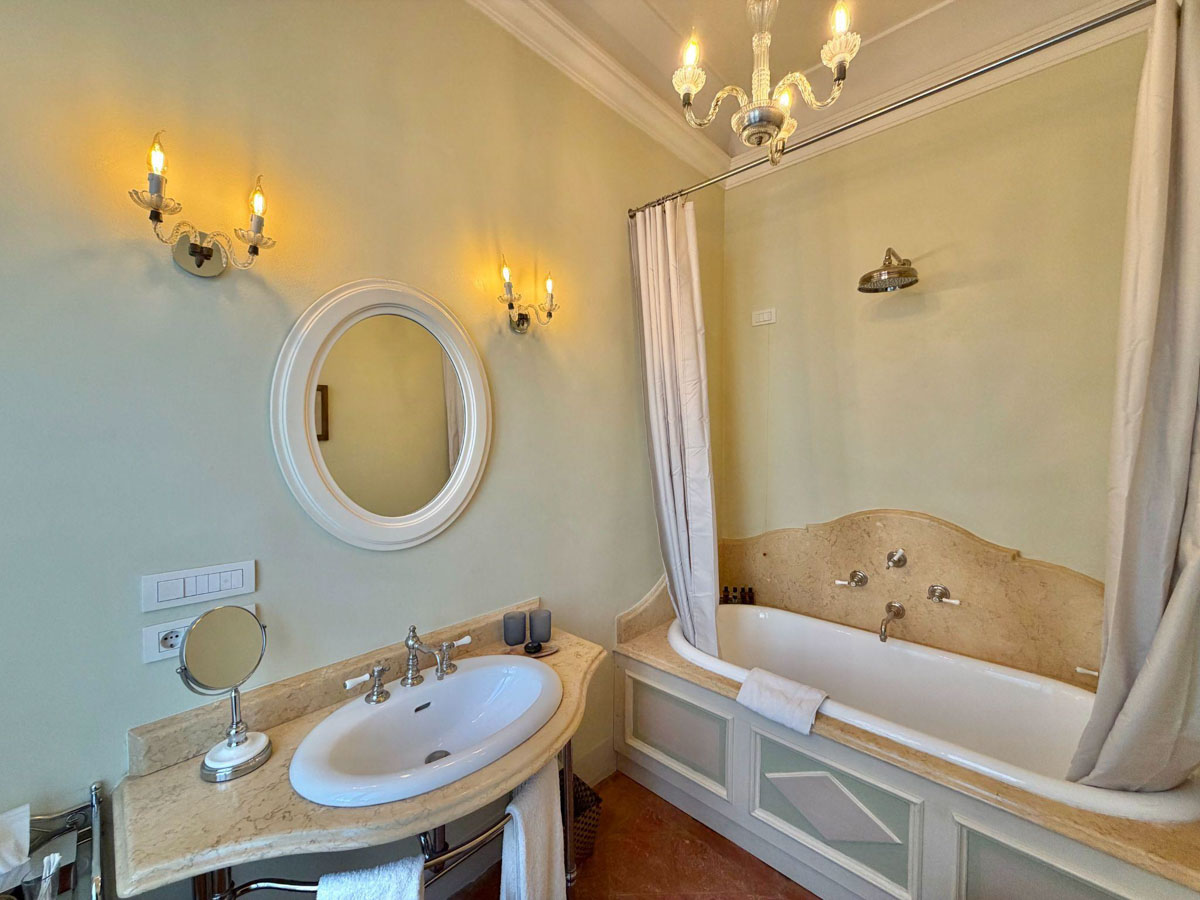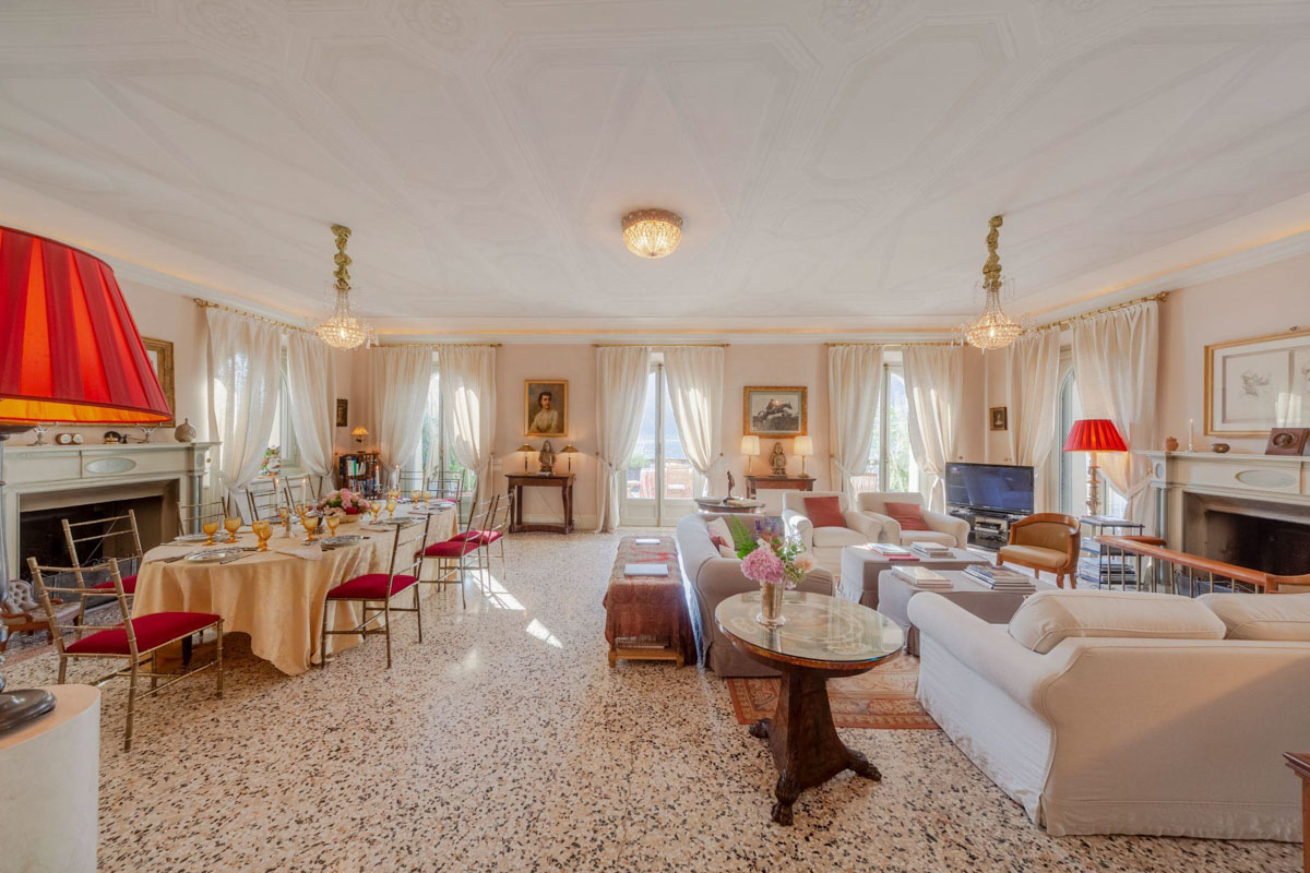 The main entrance, accessed through an underground passage connecting the two villas, leads into a grand hallway adorned with a beautiful mosaic floor. To the right, a fully-equipped professional kitchen awaits, where a dedicated chef can prepare breakfast and meals upon request. To the left, a majestic marble staircase leads to the upper floors, while straight ahead, guests are welcomed into the spacious dining and sitting rooms. Here, a striking fireplace and frescoed ceilings set the tone for a sophisticated atmosphere.