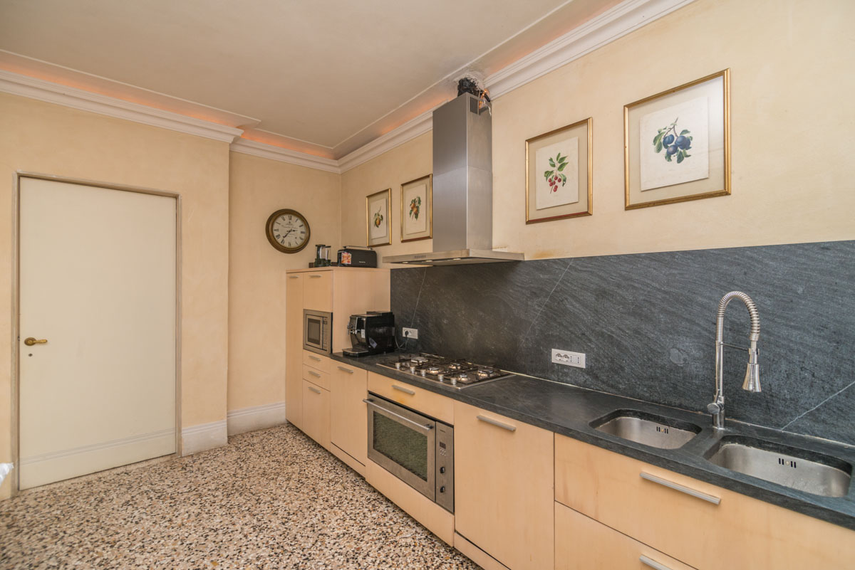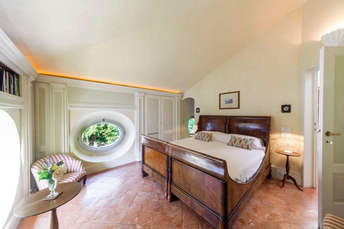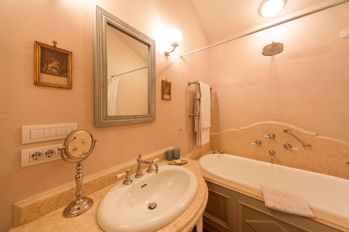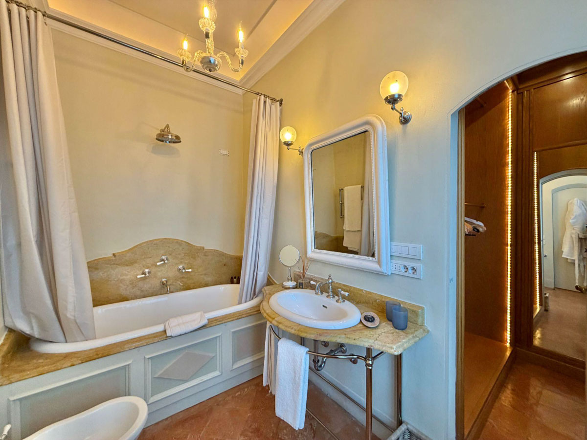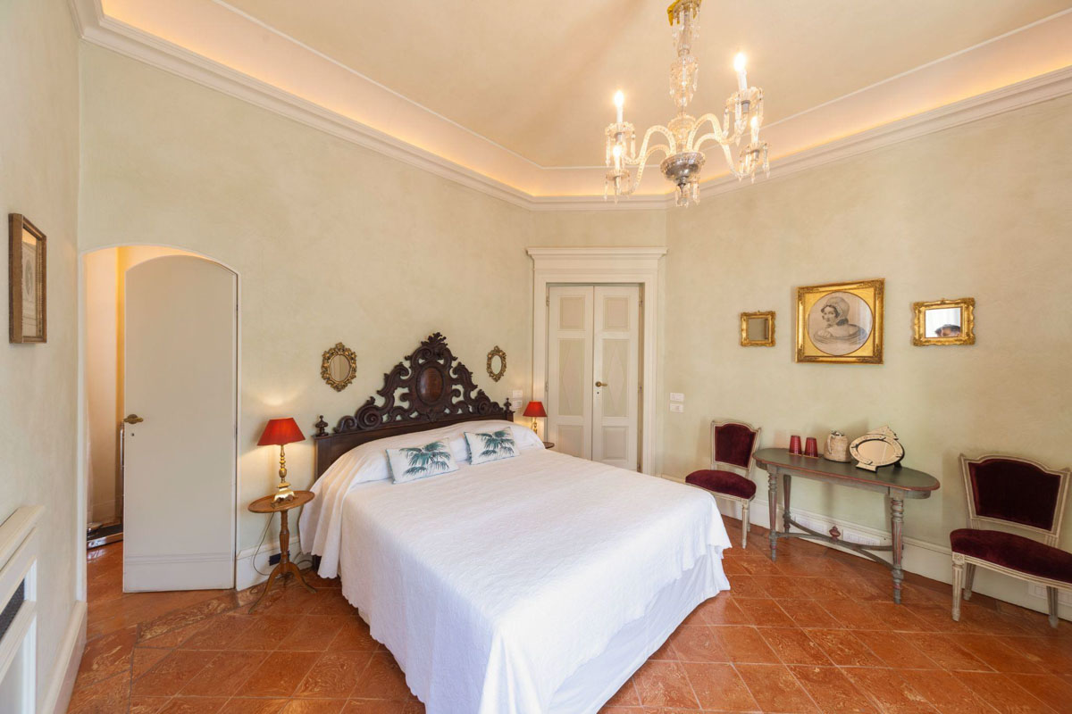 The main entrance, accessed through an underground passage connecting the two villas, leads into a grand hallway adorned with a beautiful mosaic floor. To the right, a fully-equipped professional kitchen awaits, where a dedicated chef can prepare breakfast and meals upon request. To the left, a majestic marble staircase leads to the upper floors, while straight ahead, guests are welcomed into the spacious dining and sitting rooms. Here, a striking fireplace and frescoed ceilings set the tone for a sophisticated atmosphere.