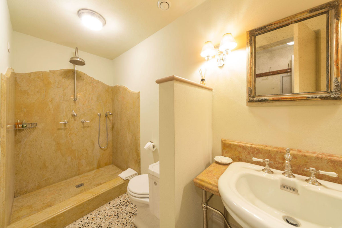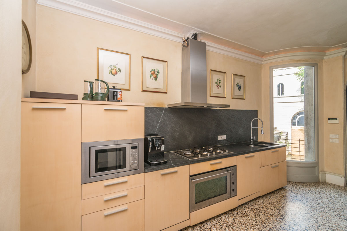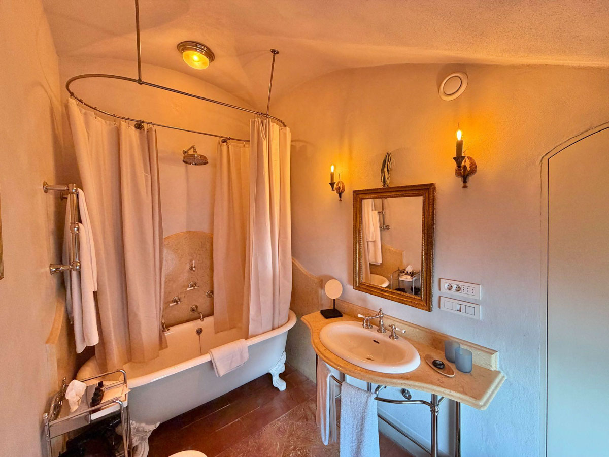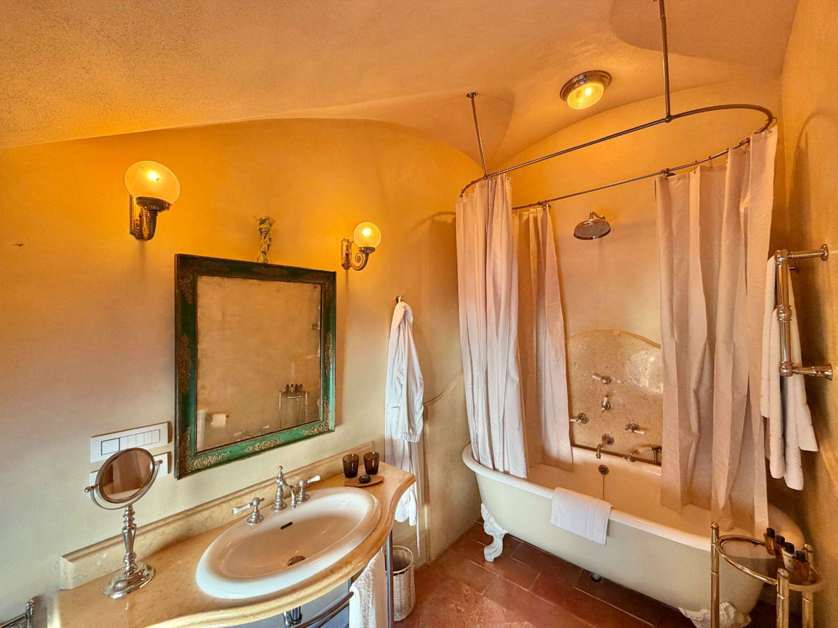 The main entrance, accessed through an underground passage connecting the two villas, leads into a grand hallway adorned with a beautiful mosaic floor. To the right, a fully-equipped professional kitchen awaits, where a dedicated chef can prepare breakfast and meals upon request. To the left, a majestic marble staircase leads to the upper floors, while straight ahead, guests are welcomed into the spacious dining and sitting rooms. Here, a striking fireplace and frescoed ceilings set the tone for a sophisticated atmosphere.