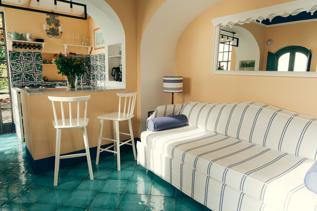 Inside, the apartment combines historical charm with modern comforts. The tower itself houses the main bedroom with a king-size bed and an en-suite bathroom with a shower, while a colourful annex on the surrounding terrace provides a cosy living room with a trundle bed for an additional guest, a small kitchen, and an additional bathroom with a shower. Air conditioning, Wi-Fi, cable TV, and a microwave ensure convenience and comfort throughout the year.
