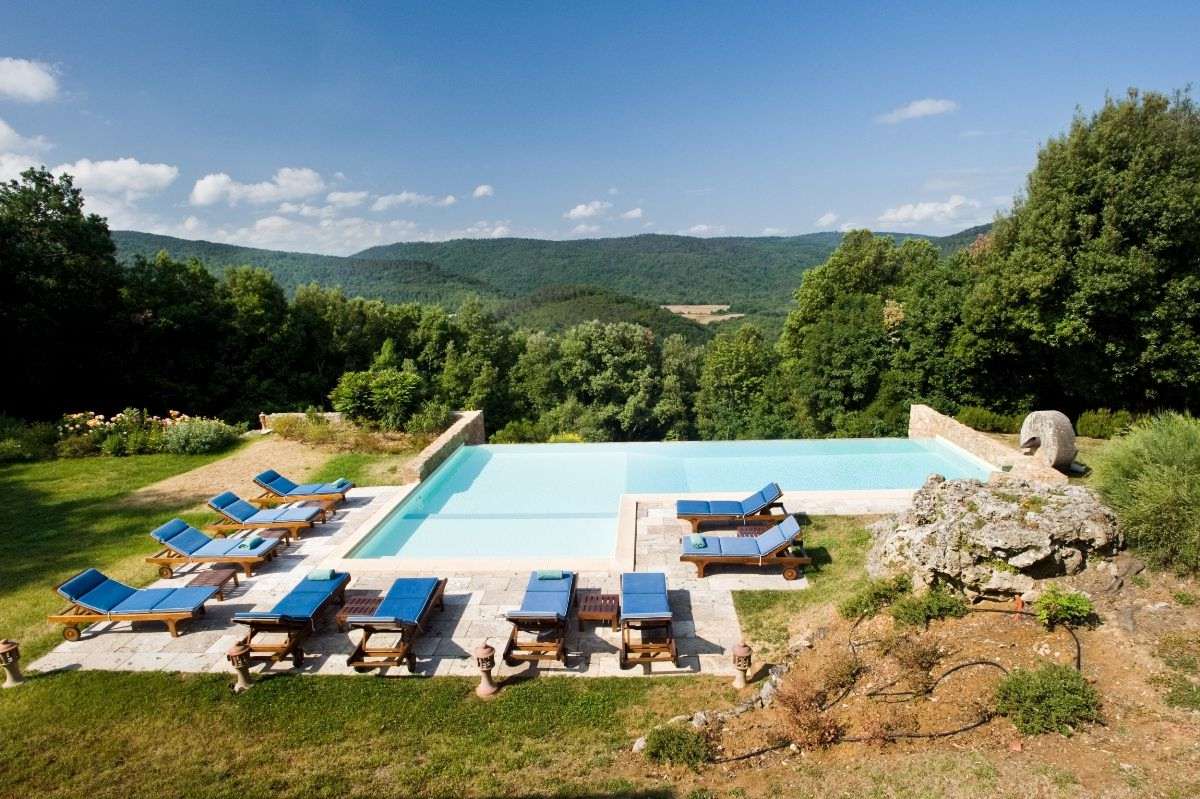 Private pool in the garden of the property. Infinity pool (4.5 x 13 m) overlooking the Montagnola Senese. Depth: 0,70 to 1,50 m. |