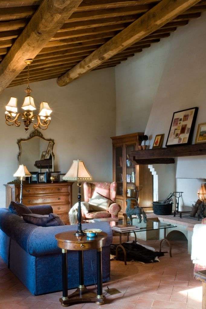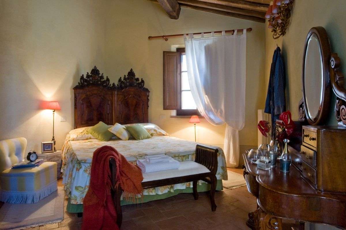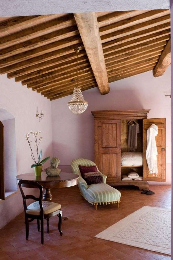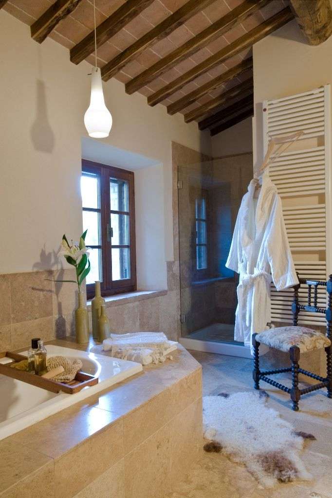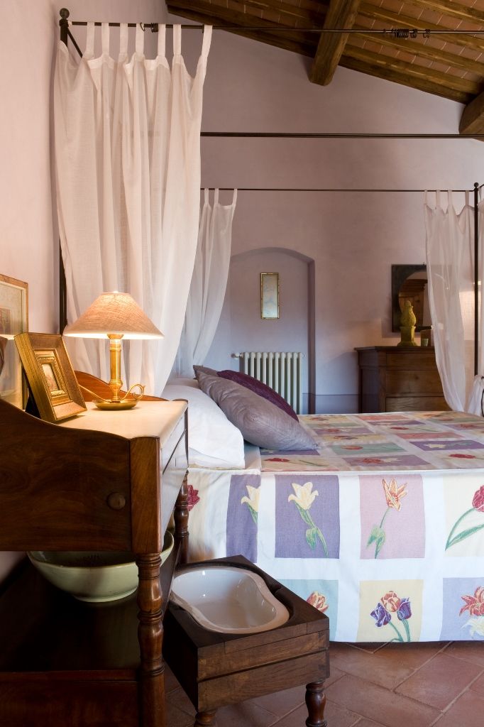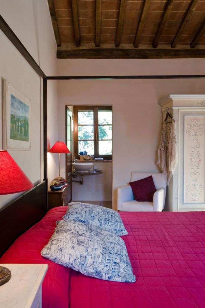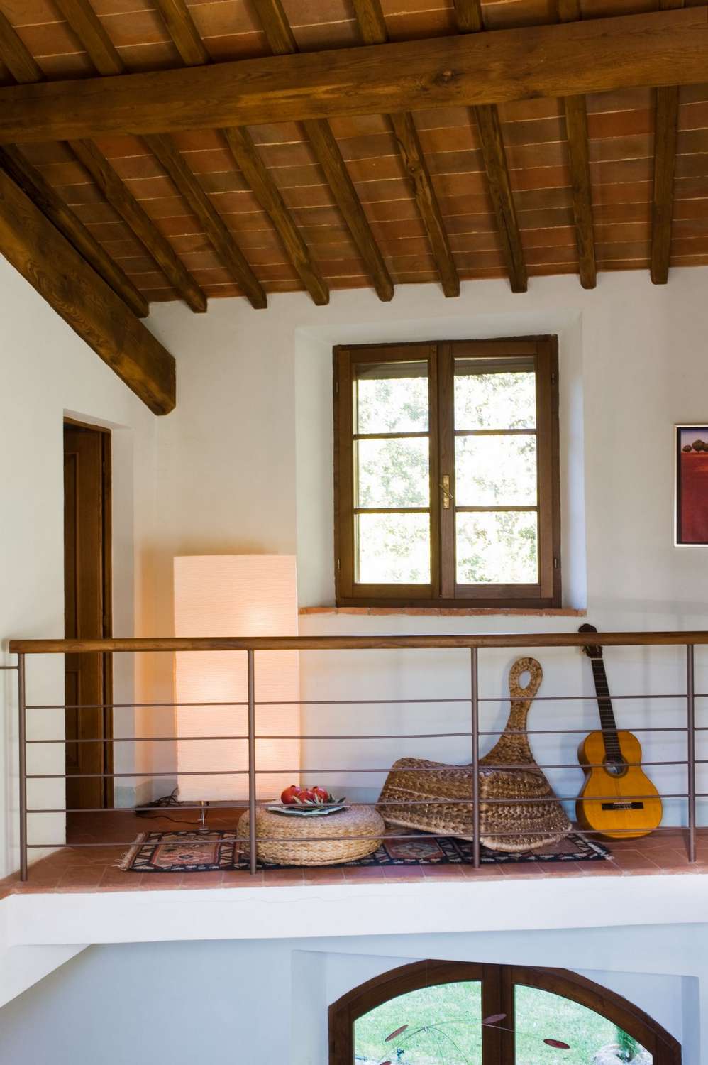 The ground floor has two, large, sitting areas with cozy armchairs and an open fire. The dining room is close to the kitchen, which features all modern conveniences for preparing delicious Tuscan dishes. The kitchen can be used for holding cooking classes and features an extra-large oven. There is also an extra bathroom on the ground floor. All of the rooms feature exposed, wooden beams on the ceilings and soft, natural colours on the walls to help create a peaceful ambience.