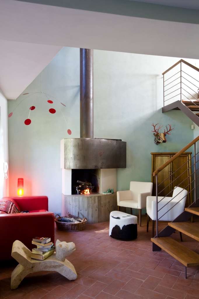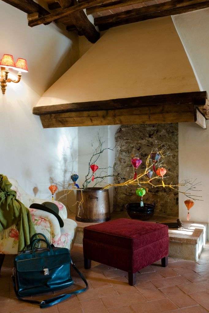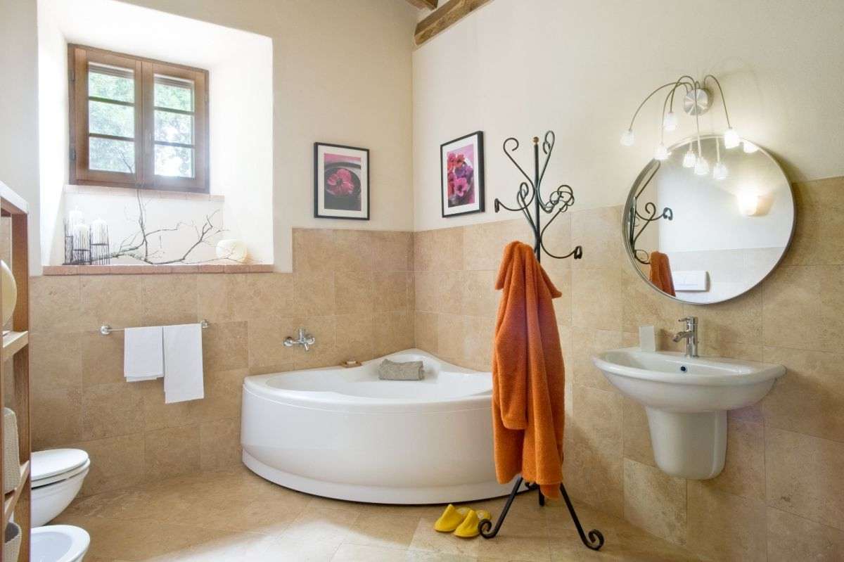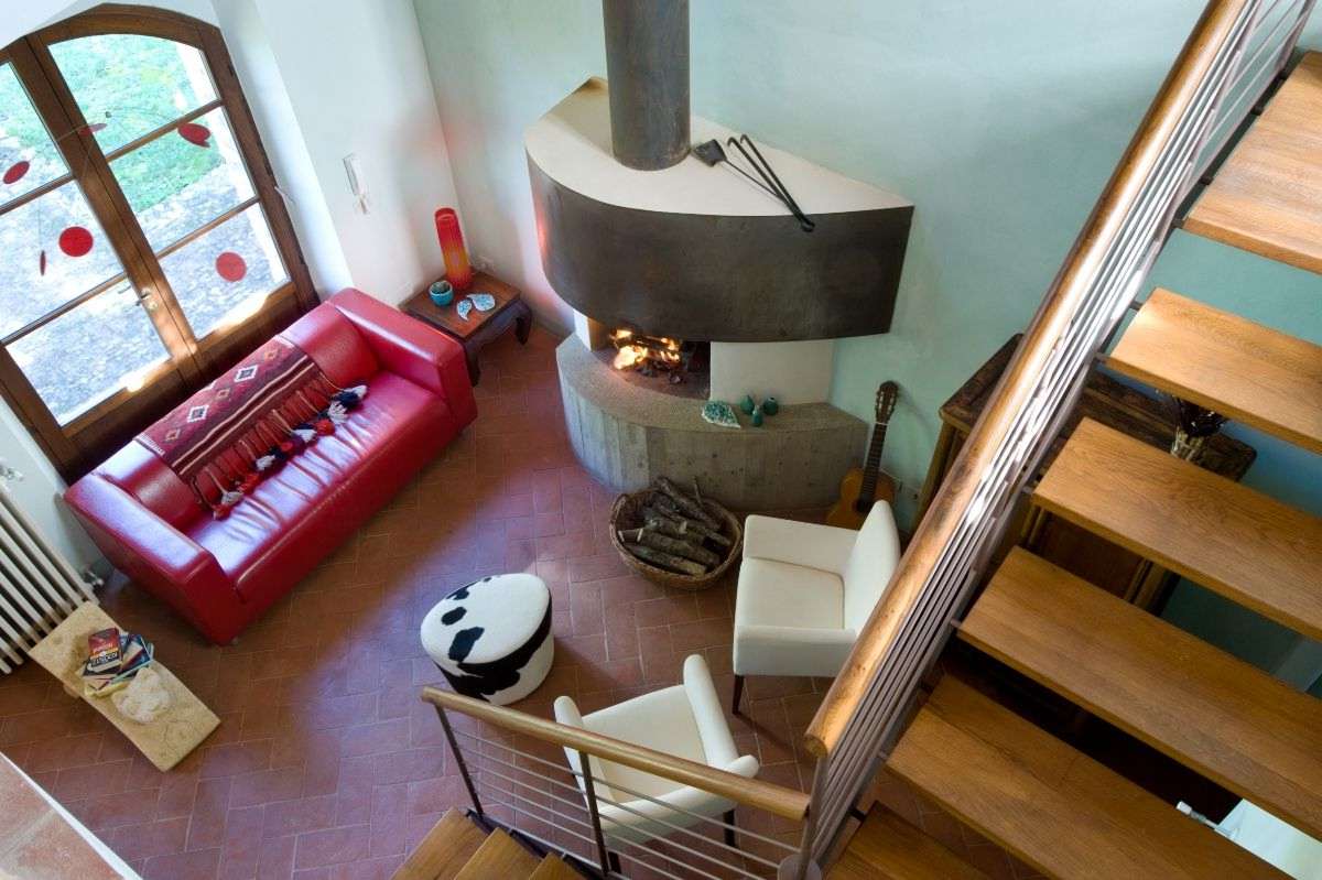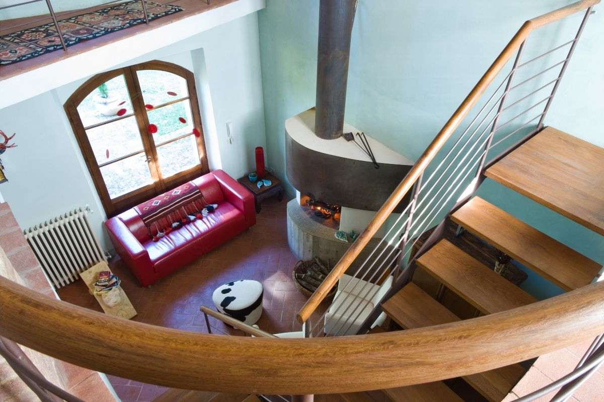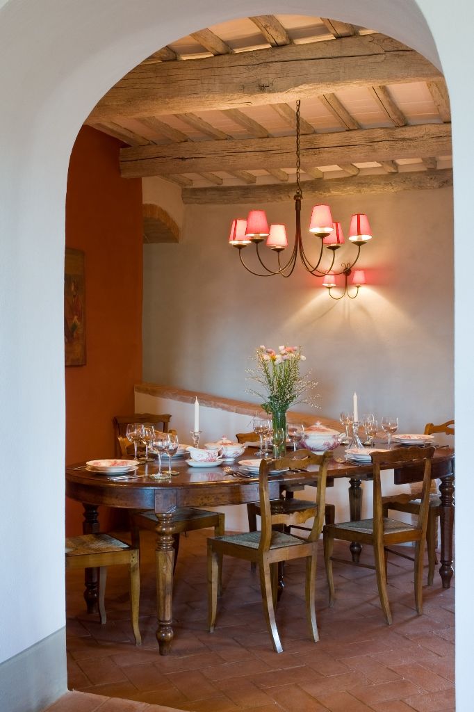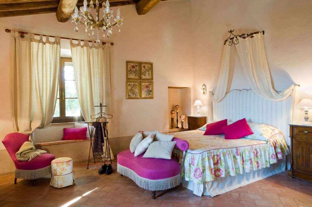 The ground floor has two, large, sitting areas with cozy armchairs and an open fire. The dining room is close to the kitchen, which features all modern conveniences for preparing delicious Tuscan dishes. The kitchen can be used for holding cooking classes and features an extra-large oven. There is also an extra bathroom on the ground floor. All of the rooms feature exposed, wooden beams on the ceilings and soft, natural colours on the walls to help create a peaceful ambience.