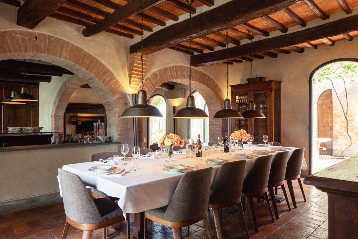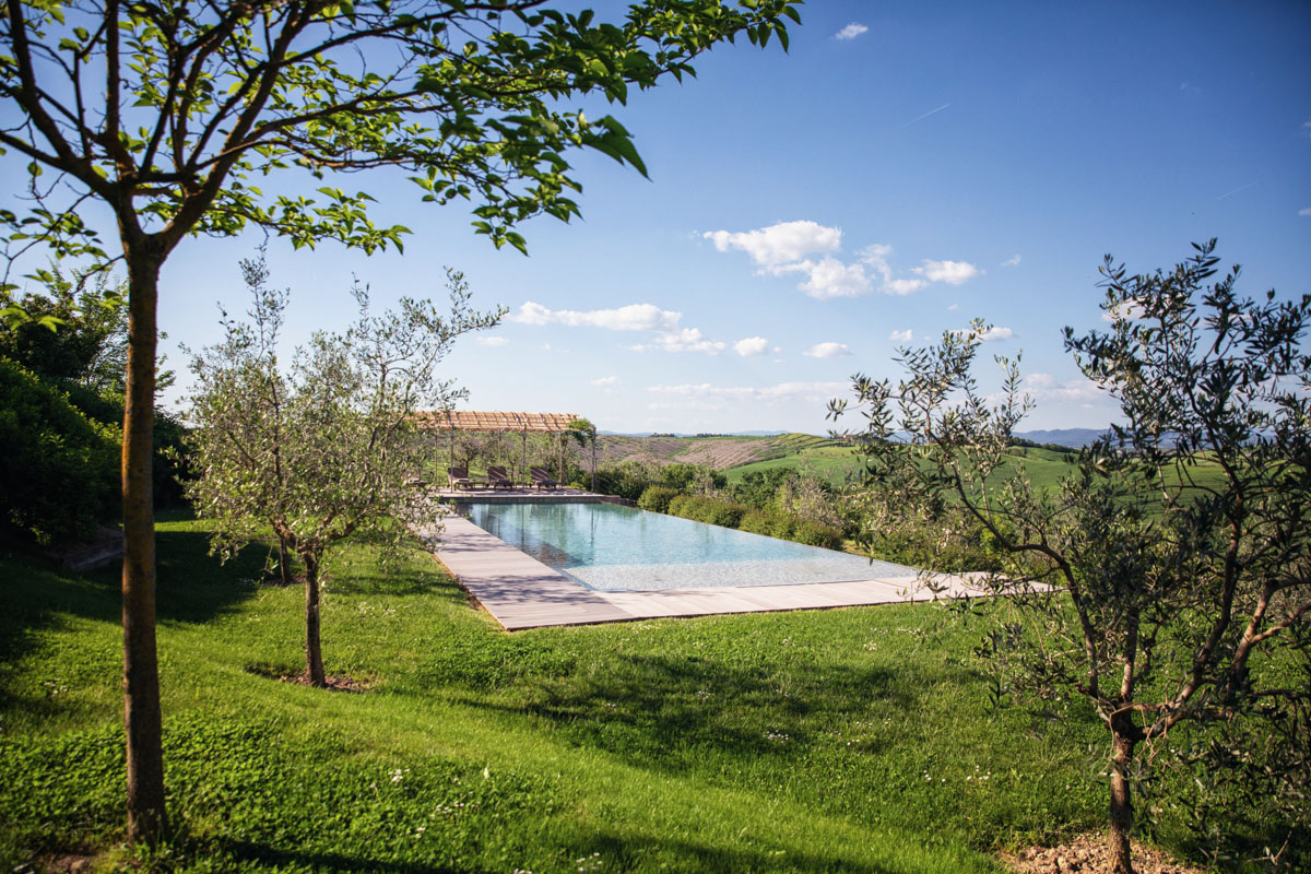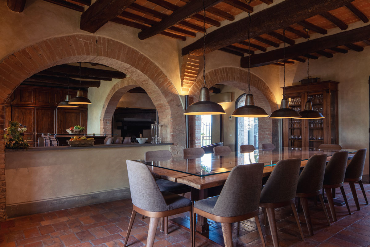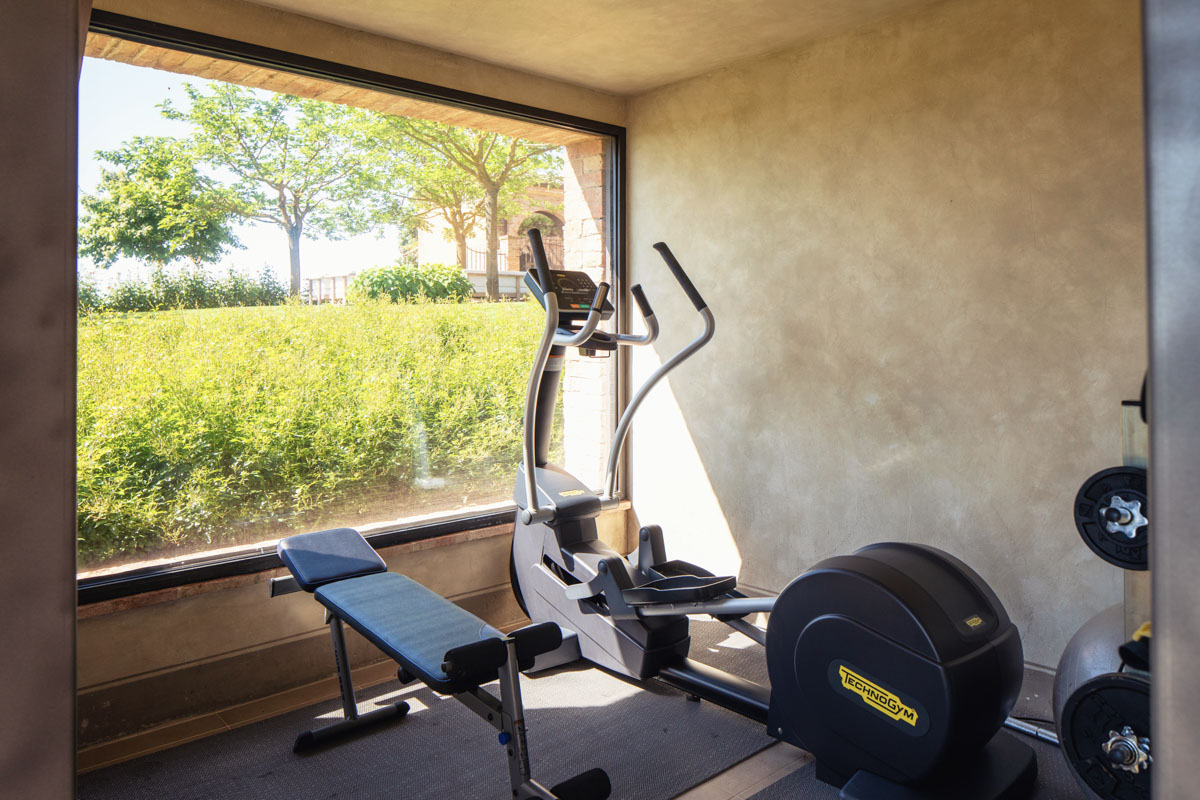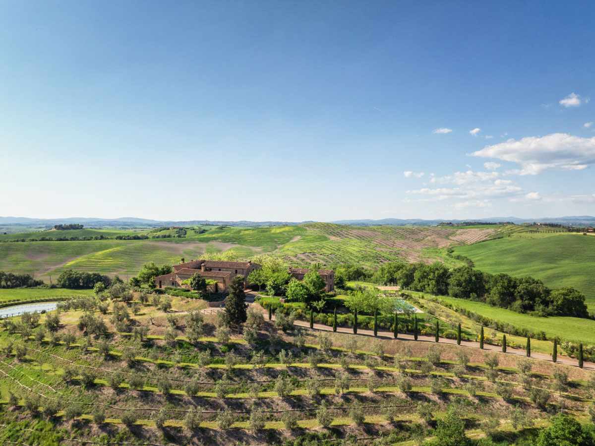 Step outside and discover five acres of perfectly maintained grounds, framed by rows of cypress trees and olive trees. The infinity pool (18 m), complete with Roman steps, invites you to unwind while taking in 360-degree views of the Crete Senesi and the towers of Siena in the distance. A paved sunbathing area with loungers, a heated hot tub, and several al fresco dining spaces provide the perfect setting to enjoy long Tuscan days under the sun. The pool house includes a sauna, a fitness room, and a dedicated space for spa treatments.