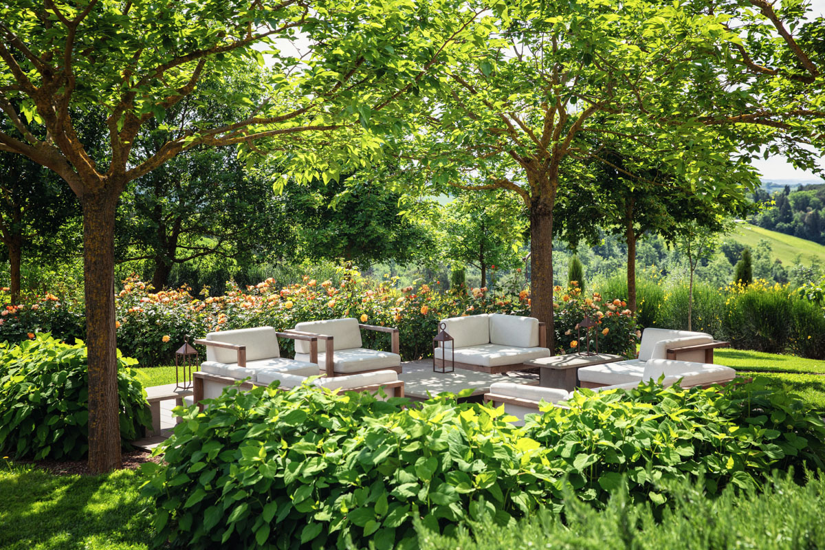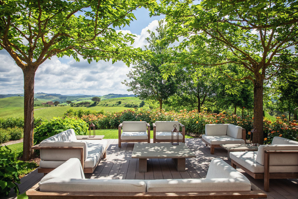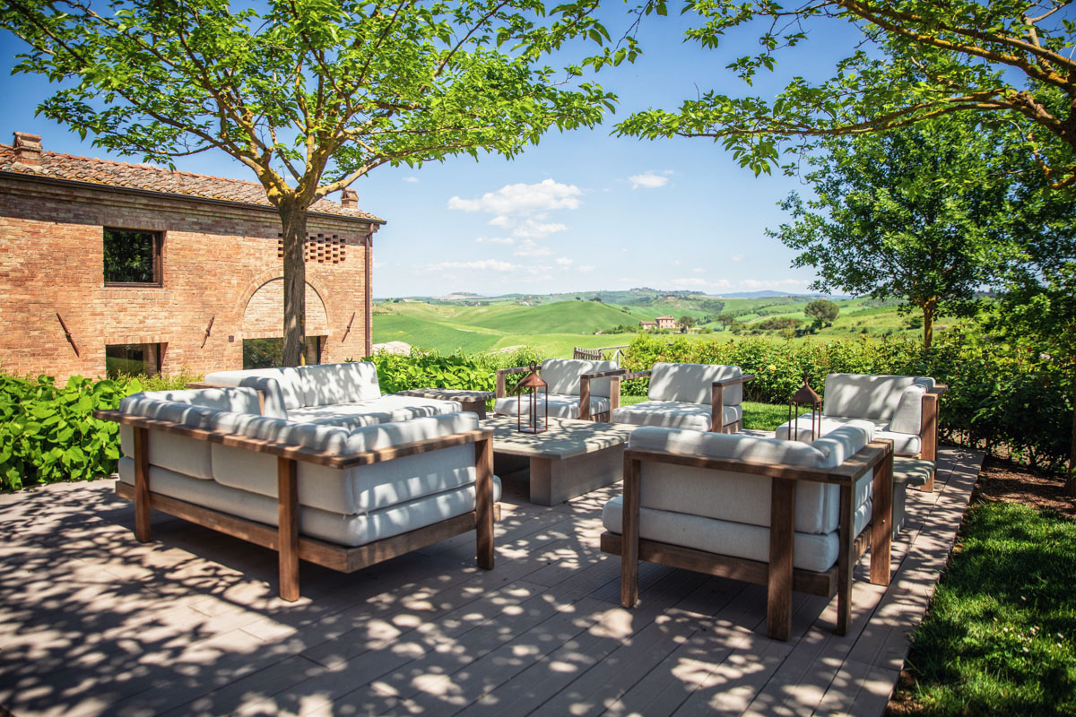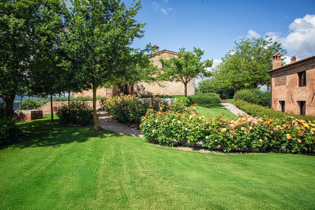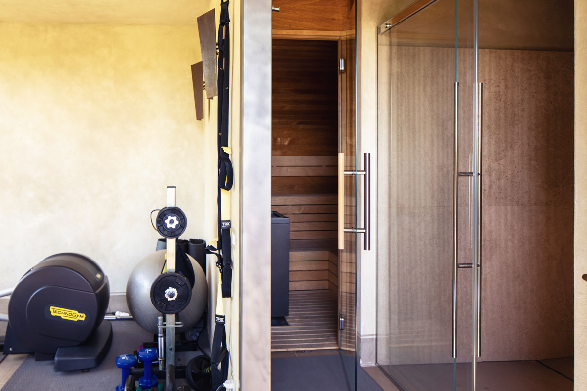Step outside and discover five acres of perfectly maintained grounds, framed by rows of cypress trees and olive trees. The infinity pool (18 m), complete with Roman steps, invites you to unwind while taking in 360-degree views of the Crete Senesi and the towers of Siena in the distance. A paved sunbathing area with loungers, a heated hot tub, and several al fresco dining spaces provide the perfect setting to enjoy long Tuscan days under the sun. The pool house includes a sauna, a fitness room, and a dedicated space for spa treatments.