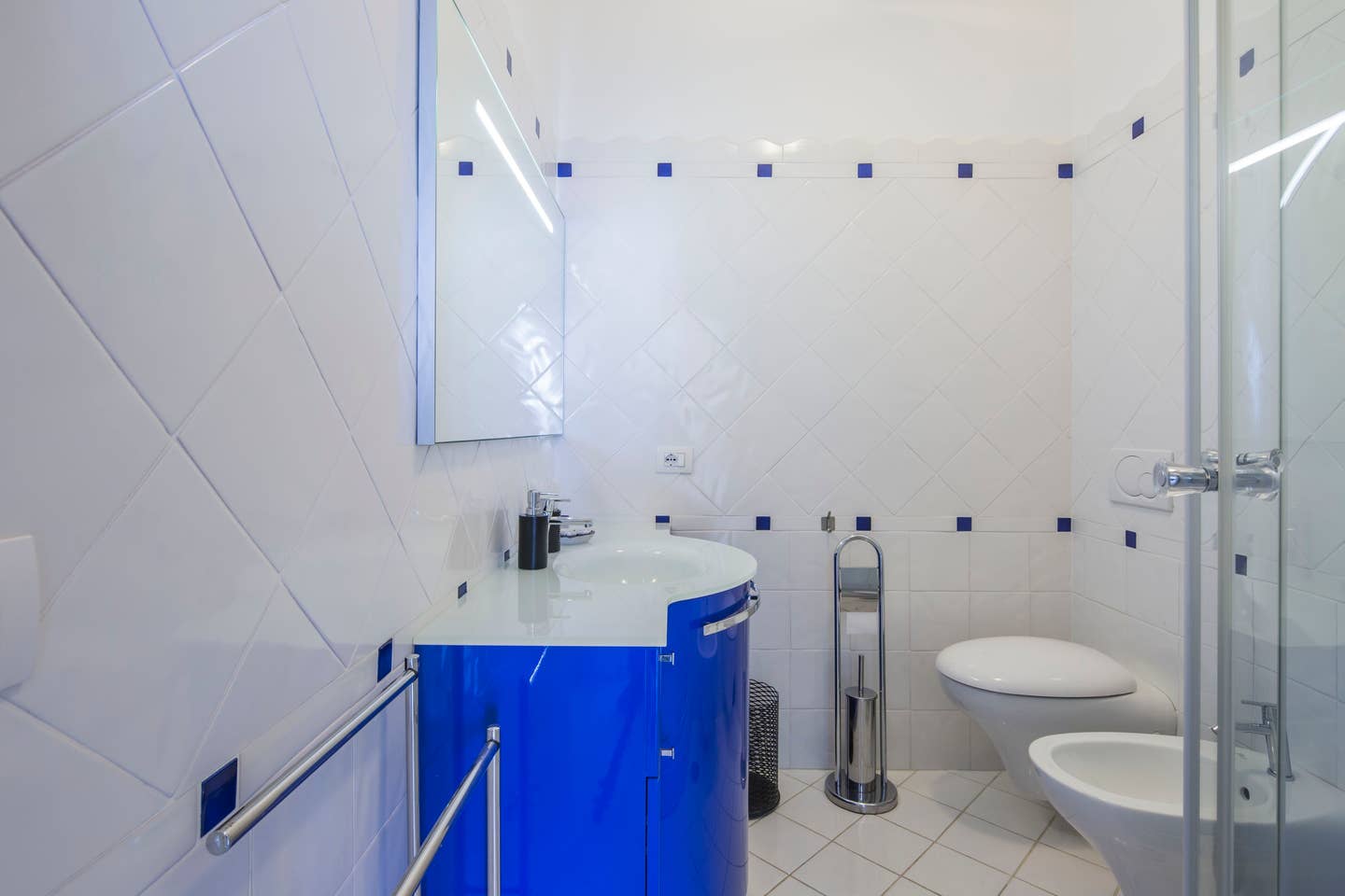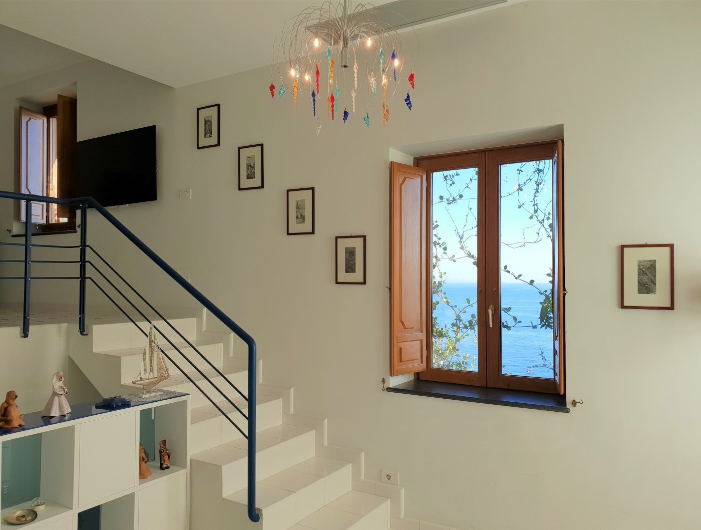 The Property. Property 10694 is built into the cliff face above the water and offers spectacular views out across the Mediterranean. This magnificent property sleeps up to eight guests in four double bedrooms, three of which have sea views. There are four bathrooms, two sitting rooms and two kitchens. The interior has recently been redecorated and refurbished and now features hand-painted, majolica floors. Both sitting rooms have large-screen, high-definition TVs. Given that each floor contains two bedrooms, two bathrooms, a sitting room and a kitchen, the villa can be easily divided into two separate living spaces.