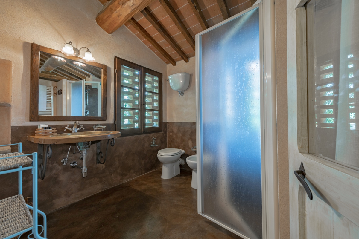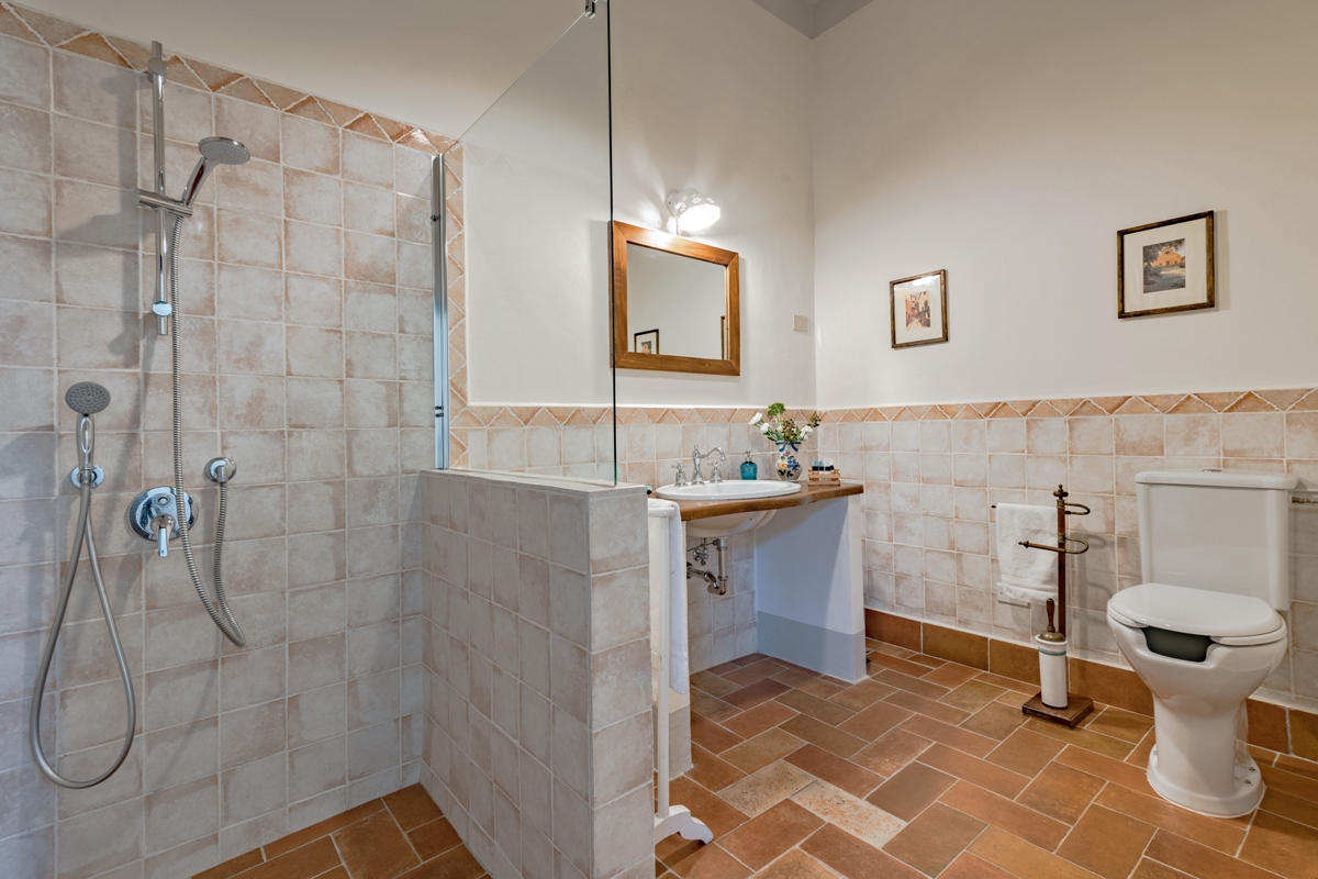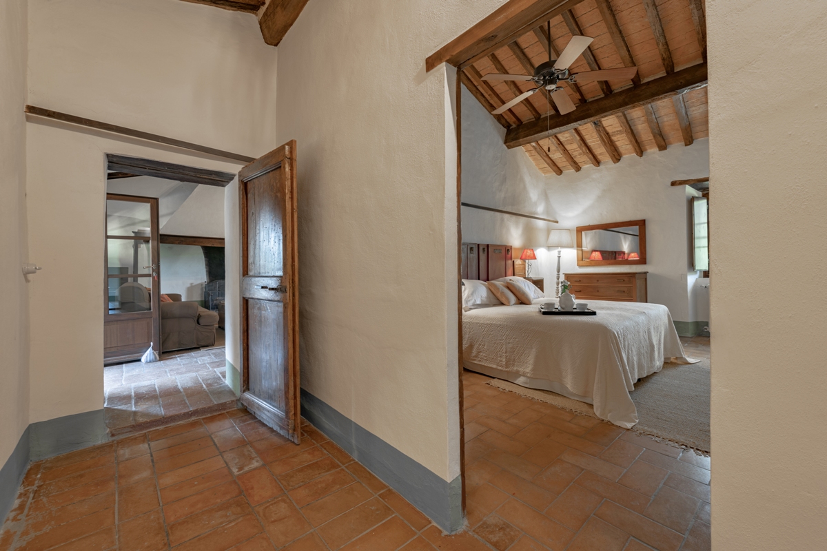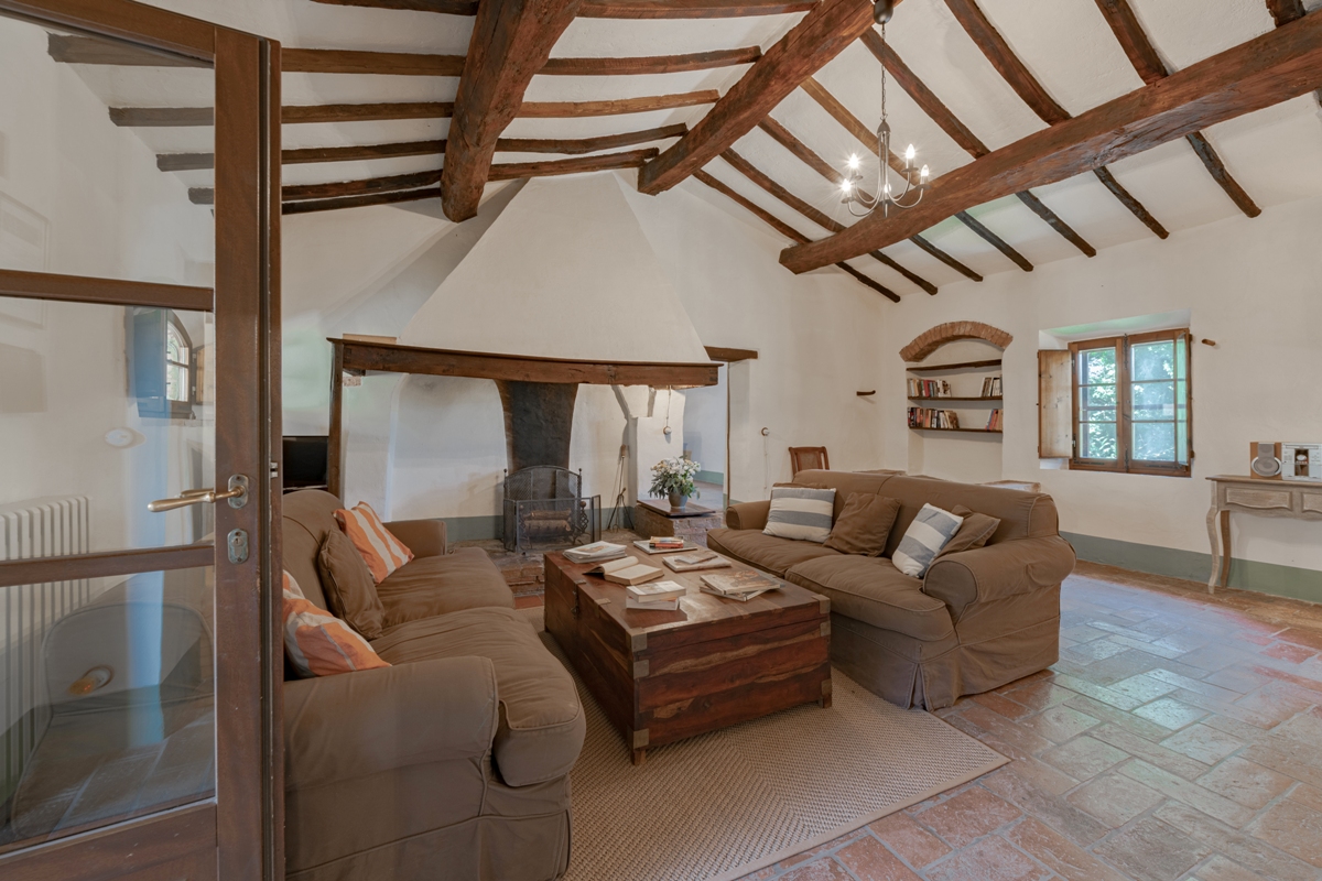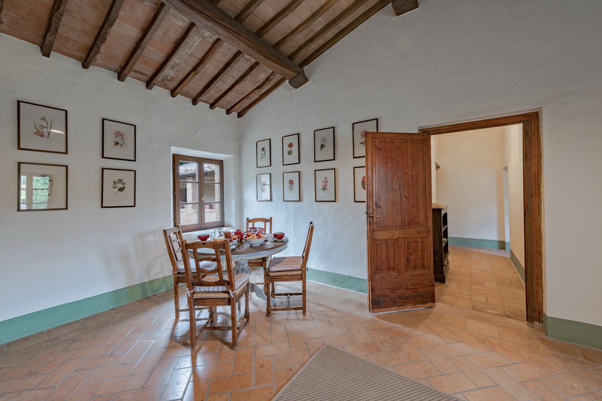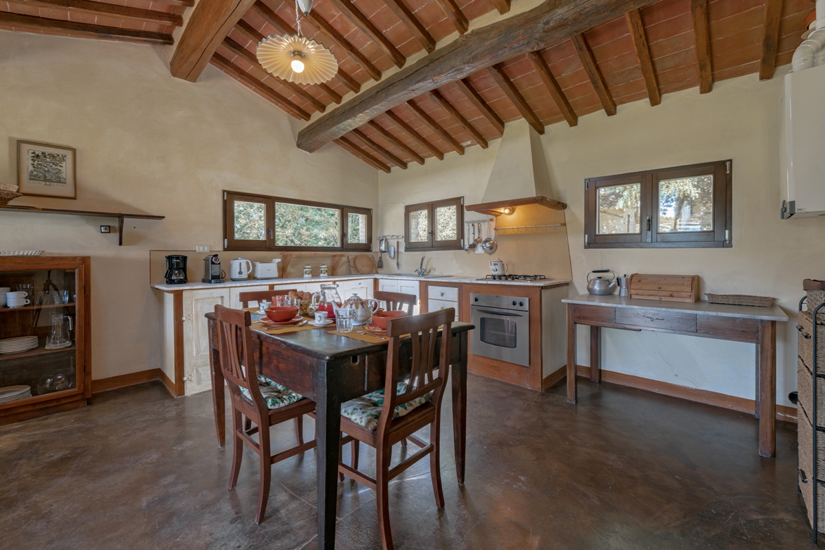 On the same floor, you will also find a large living room with a traditional fireplace and comfortable sofas. As the evening falls, gather around the fire, relax, and enjoy a glass of Brunello with your fellow guests, taking in the warm and inviting atmosphere. The rustic charm continues in the spacious Tuscan-style kitchen, also on this floor, which features a small table where guests can enjoy a leisurely breakfast, sitting beneath the beautiful timber ceiling. The perfect setting to start your day surrounded by Tuscan warmth and character.