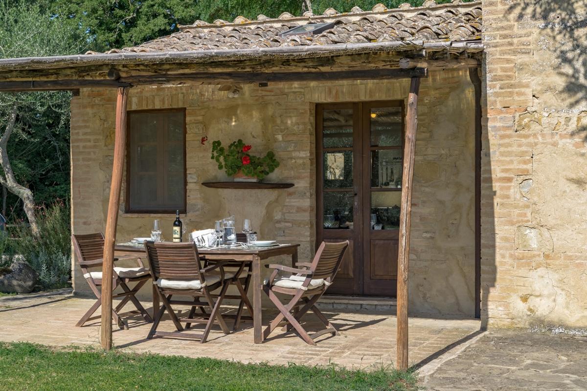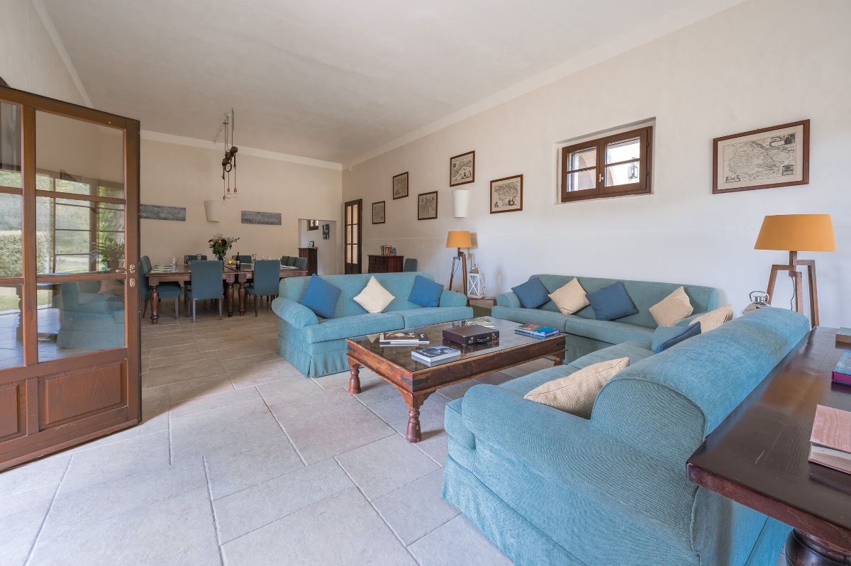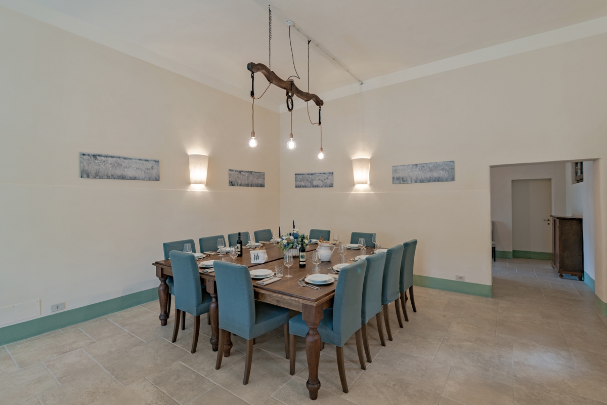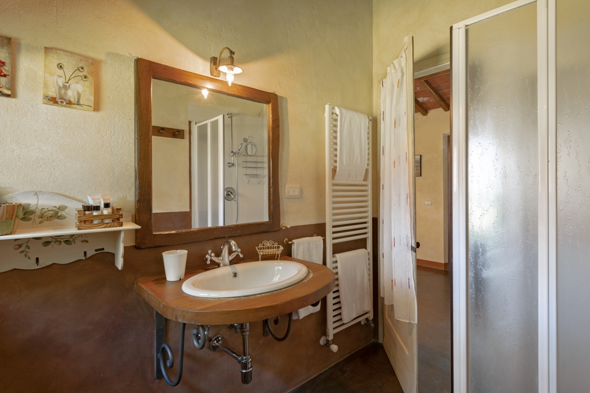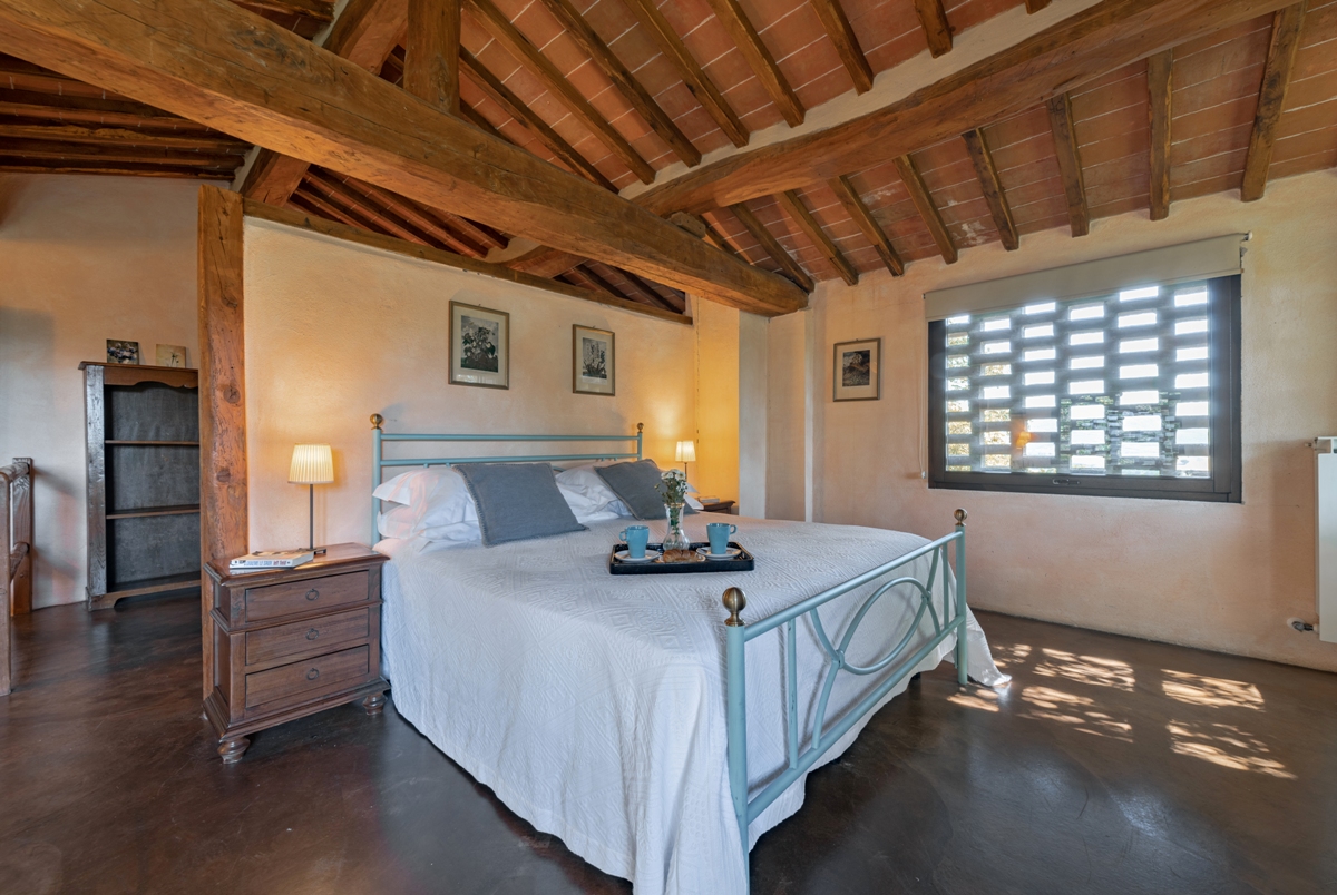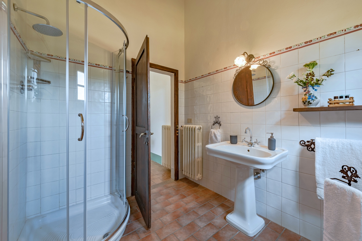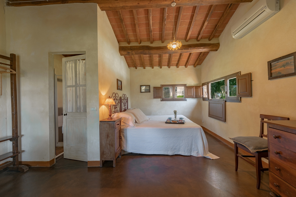 On the same floor, you will also find a large living room with a traditional fireplace and comfortable sofas. As the evening falls, gather around the fire, relax, and enjoy a glass of Brunello with your fellow guests, taking in the warm and inviting atmosphere. The rustic charm continues in the spacious Tuscan-style kitchen, also on this floor, which features a small table where guests can enjoy a leisurely breakfast, sitting beneath the beautiful timber ceiling. The perfect setting to start your day surrounded by Tuscan warmth and character.