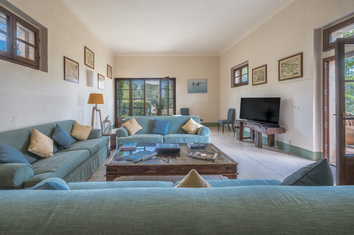 The main villa offers nine bedrooms and eight bathrooms spread across the north and south wings. On the ground floor of the north wing, the interior living space is furnished with comfortable sofas offering plenty of seating, while large windows constantly provide inviting views over the garden, creating a luminous and airy atmosphere dominated by light colours. The ground floor also houses a large dining area and a modern, fully-equipped kitchen.