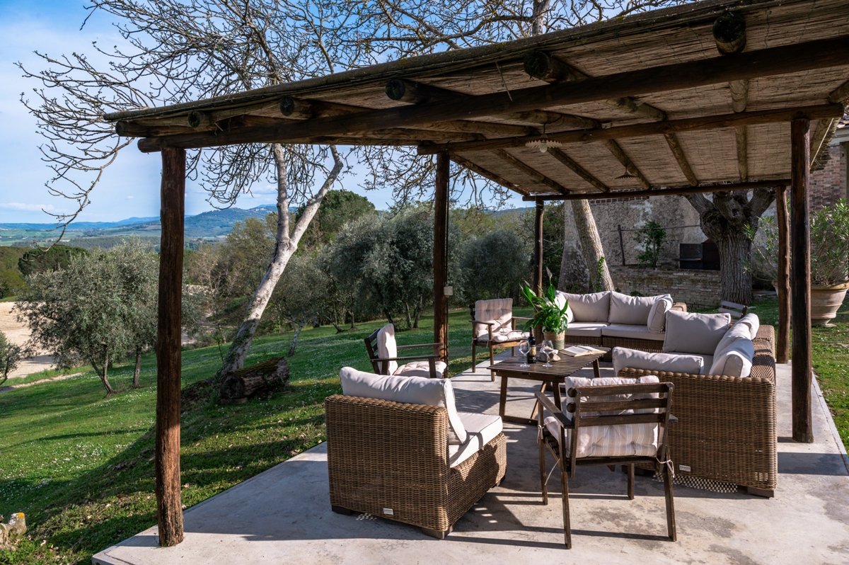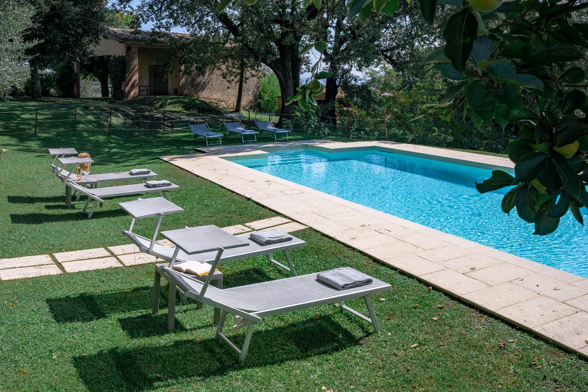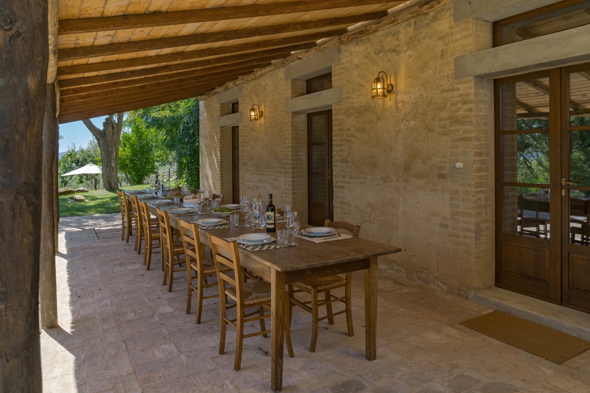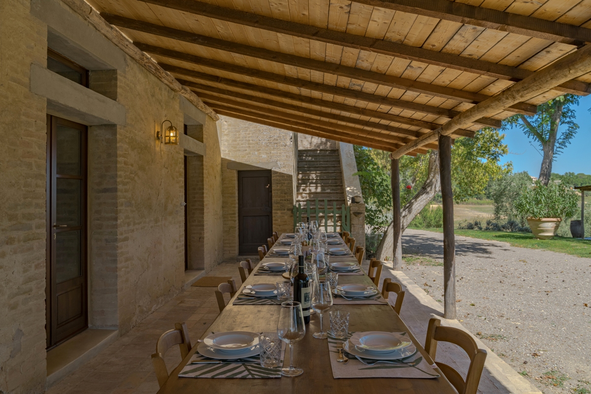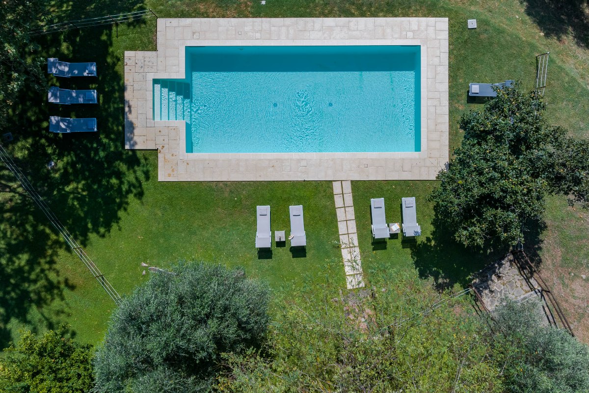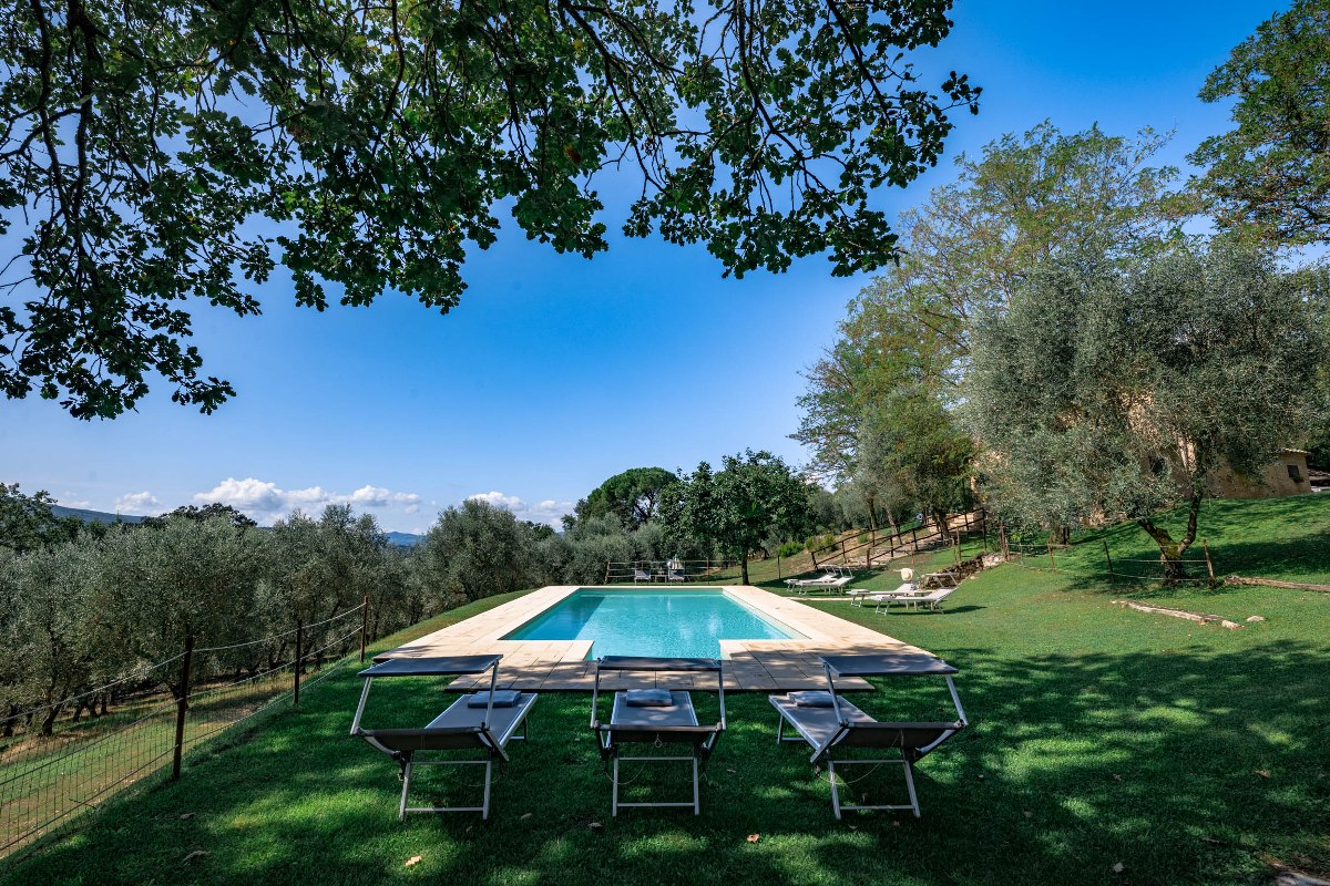Surrounded by a lush garden, the property features a stunning swimming pool and a spacious poolside area with sun loungers, deckchairs, and parasols for shade on warm days. The sweeping views of the countryside provide a serene atmosphere, making the poolside a perfect spot for relaxation with a book or a glass of prosecco. The garden also includes a generous al fresco dining area with a barbecue. A newly built covered lounge area adds to the outdoor charm, while the main façade of the villa has been beautifully restored.