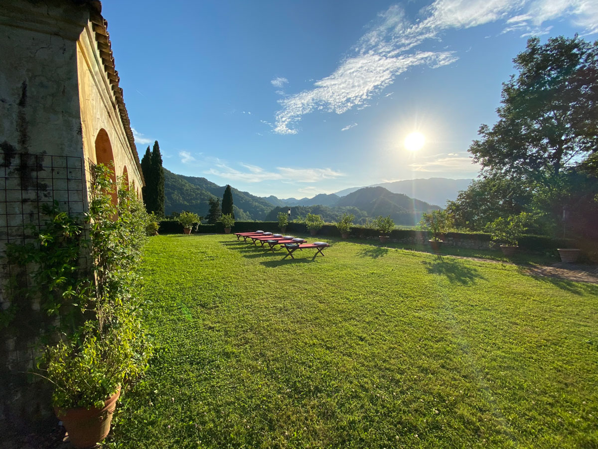 The castle is surrounded by a lush garden where you will find a magnificent swimming pool, an arch-vaulted loggia, and a spacious poolside area equipped with comfortable sun loungers inviting guests to sit back and unwind. Offering a tranquil atmosphere, the poolside area is an idyllic spot for sunbathing and enjoying relaxing moments with a good book and a glass of Prosecco. The property also features a generous courtyard complete with an elegant al fresco dining area and a large table.
