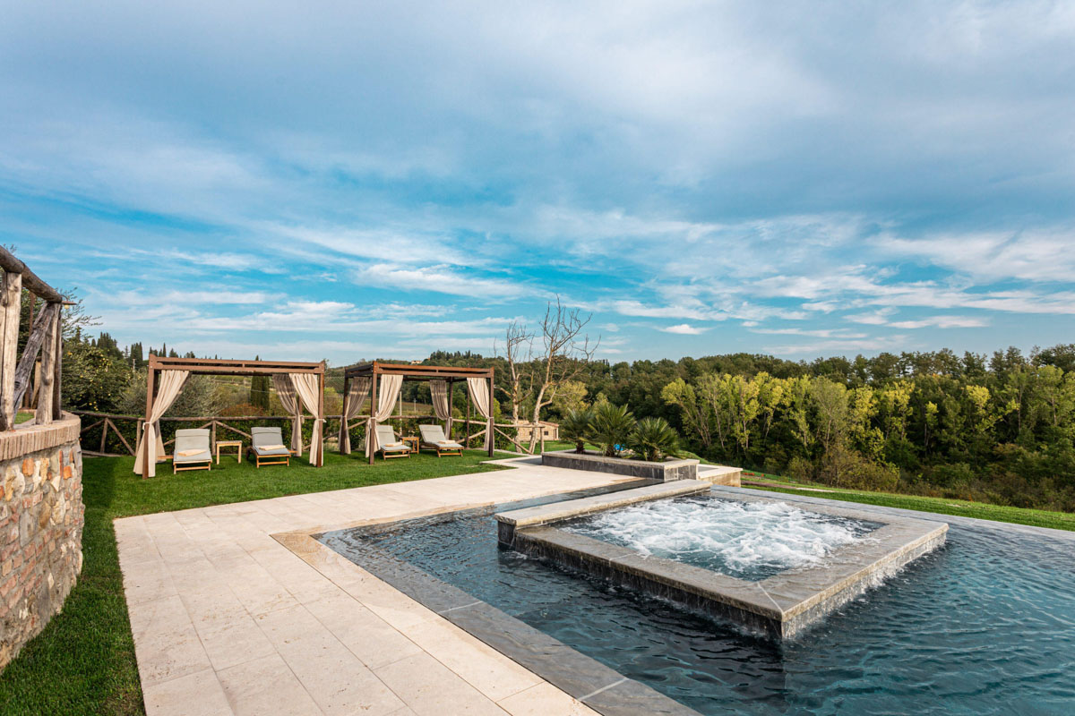 Property 1605885689 has been restored with valuable materials such as ancient handmade terracotta, bathrooms completely in travertine and kitchens in Carrara marble "calacatta", chestnut beams and fixtures in fine local cypress wood. The villa can accommodate up to ten guests featuring five bedrooms with en-suite bathroom, Property 1605885689 enjoys spectacular views of the famous towers of San Gimignano. A large garden surrounds the entire structure and also the four-sided infinity pool with spa whirlpool, made with valuable stone of Cardoso, renowned local stone. Next to the swimming pool is a big dependance with large panoramic terrace, equipped outdoor kitchen, barbeque, bar area, relaxation area and a large table to enjoy outdoor dining.