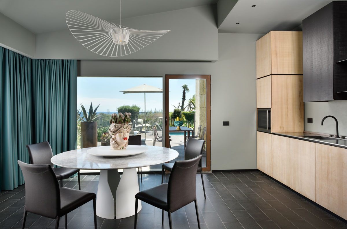 Flooded with light, this 145-sqm villa boasts refined interiors with authentic designer furniture and pieces. With a modern design, the villa boasts a spacious open-plan living and dining area with kitchen overlooking the outdoor area and the pool. Near this room, you will also find a handy guest bathroom. With an airy atmosphere dominated by neutral colors, the villa sleeps four guests featuring two double bedrooms, each complete with en-suite bathroom (one with a free-standing bathtub and one with shower).