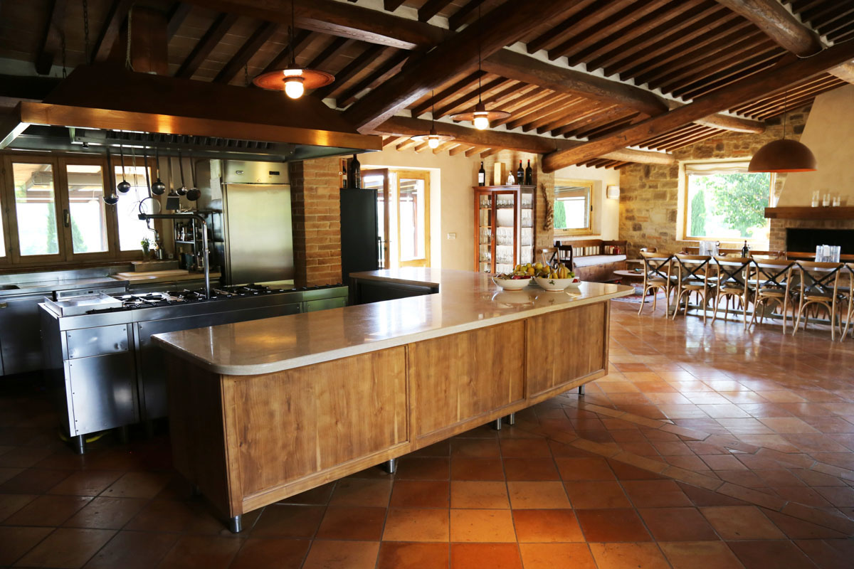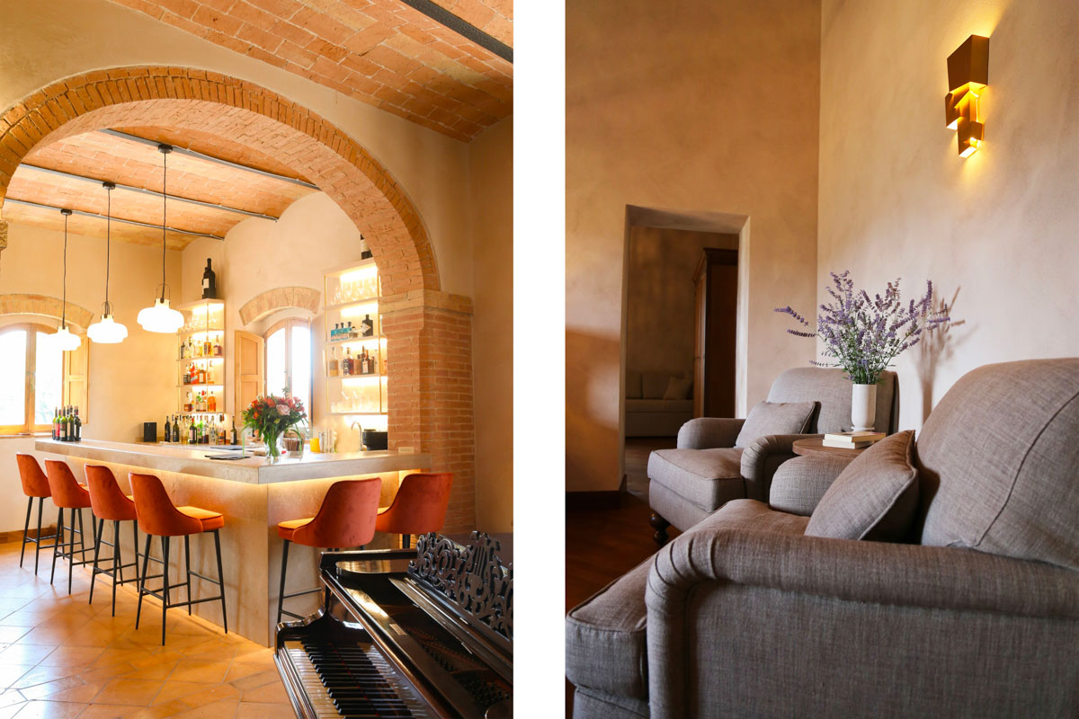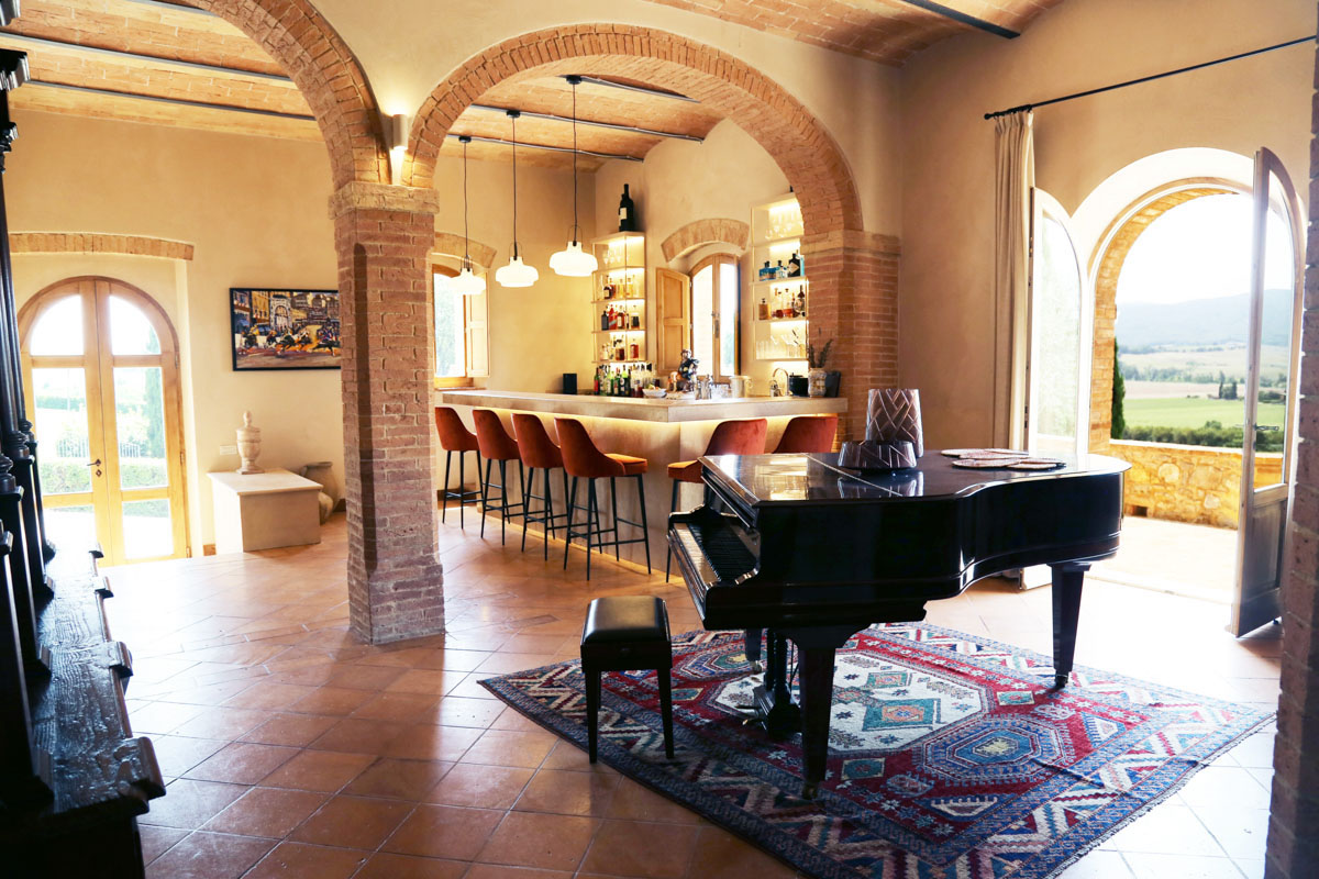 This stunning villa features a ground floor with vaulted ceilings, a spacious salon with a grand dining area, a kitchen, and a cosy living room with a flat-screen TV. A beautifully appointed bar area with a grand piano lead seamlessly to a terrace boasting breathtaking views of Montalcino and the valley below. The villa features seven double bedrooms, two on the ground floor and five on the first floor, each with en-suite bathrooms and air conditioning. The ground floor also has two guest bathrooms.