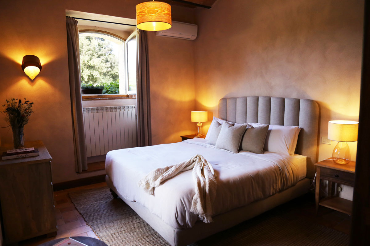 The second floor of Villa Casalone opens to an inviting living area and a cosy library, providing ample space for relaxation. SONOS speakers are placed throughout the villa, ensuring an immersive and uninterrupted music experience in every communal space. Among the seven exquisitely appointed bedrooms, one boasts a charming loft on the second floor with a convenient pull-out bed for two children, while another offers a separate room with two comfortable single beds for two additional children.