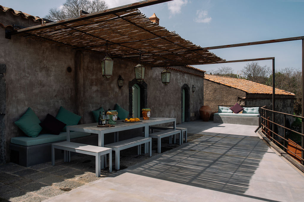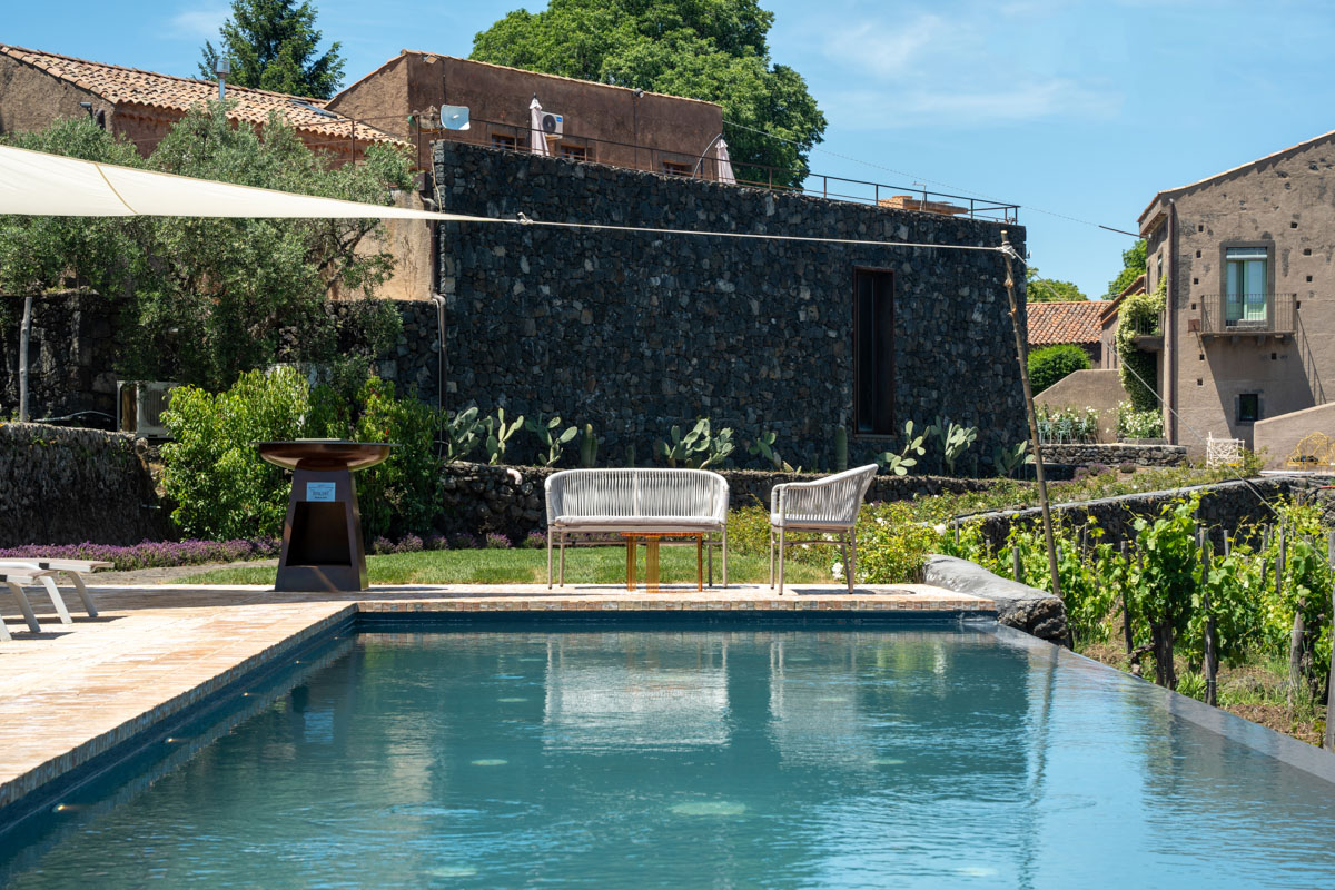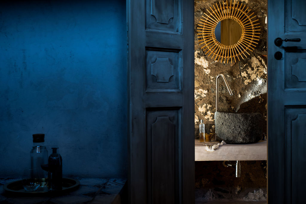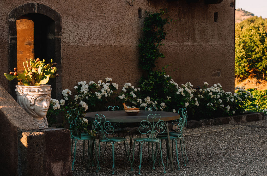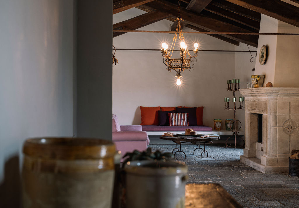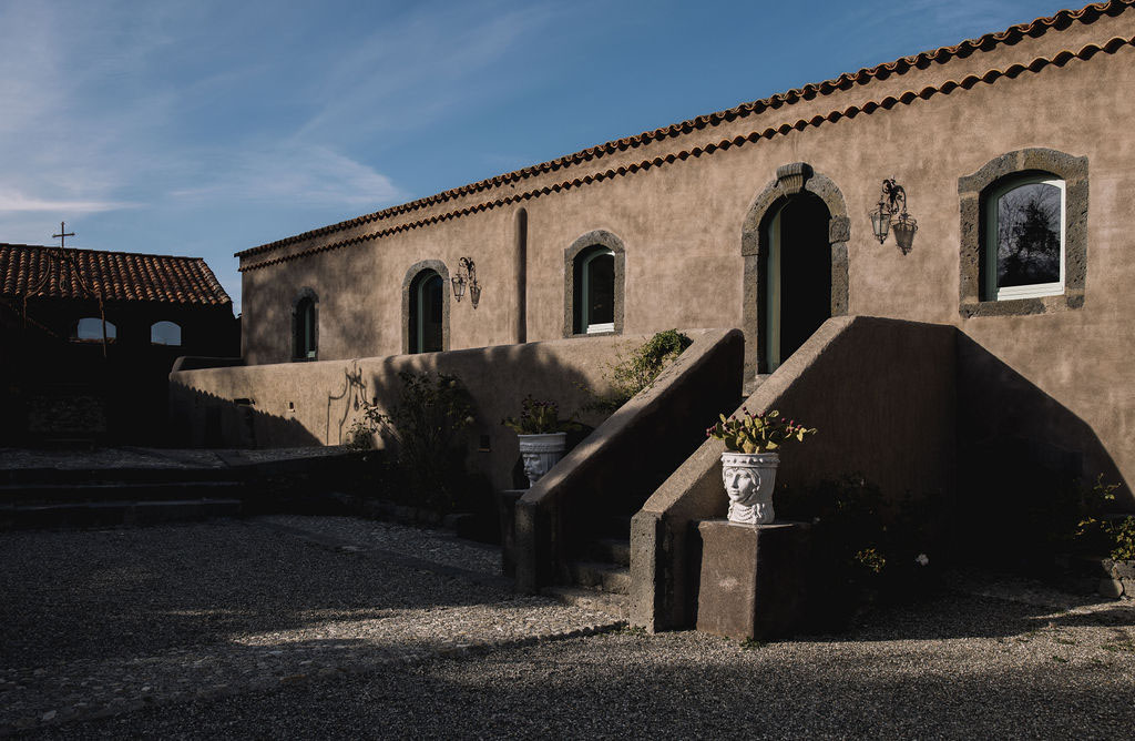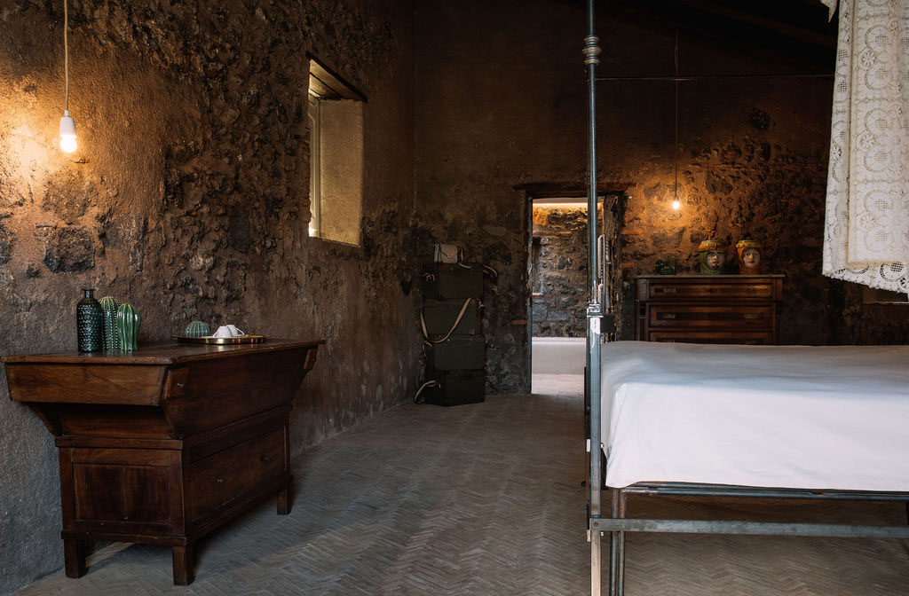The interiors capture the essence of Sicily through a blend of traditional craftsmanship and contemporary design. Decorative lava stone, wrought iron accents, and intricate lace details adorn the rooms, evoking a warm yet refined atmosphere. Each of the seven bedrooms is uniquely styled to provide an immersive experience, inspired by the estate's winemaking heritage and the timeless allure of the Sicilian landscape. Guests can enjoy modern comforts while surrounded by touches of Sicily’s rich heritage.