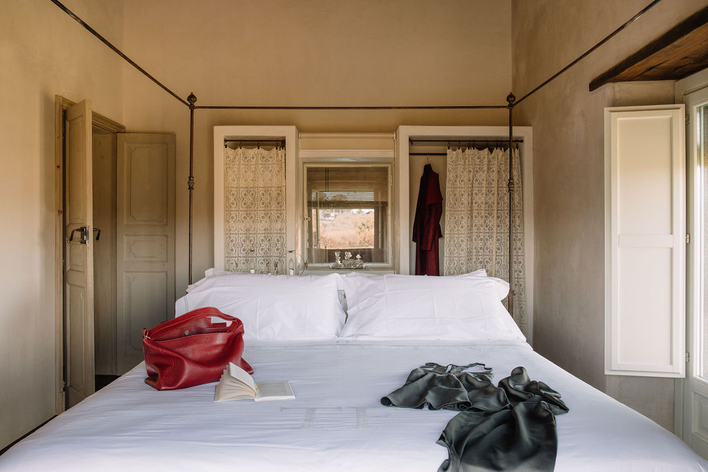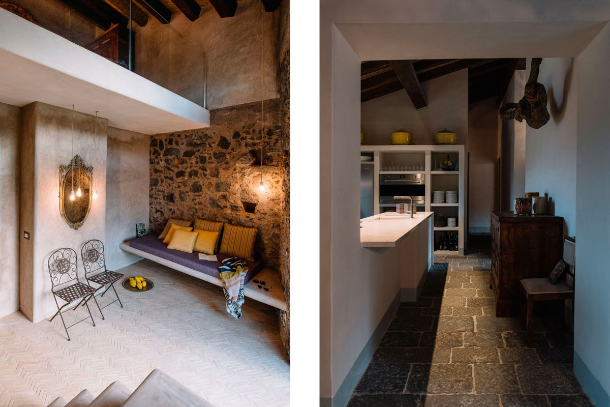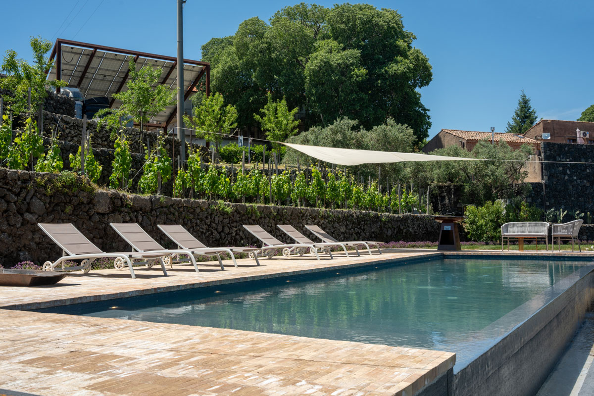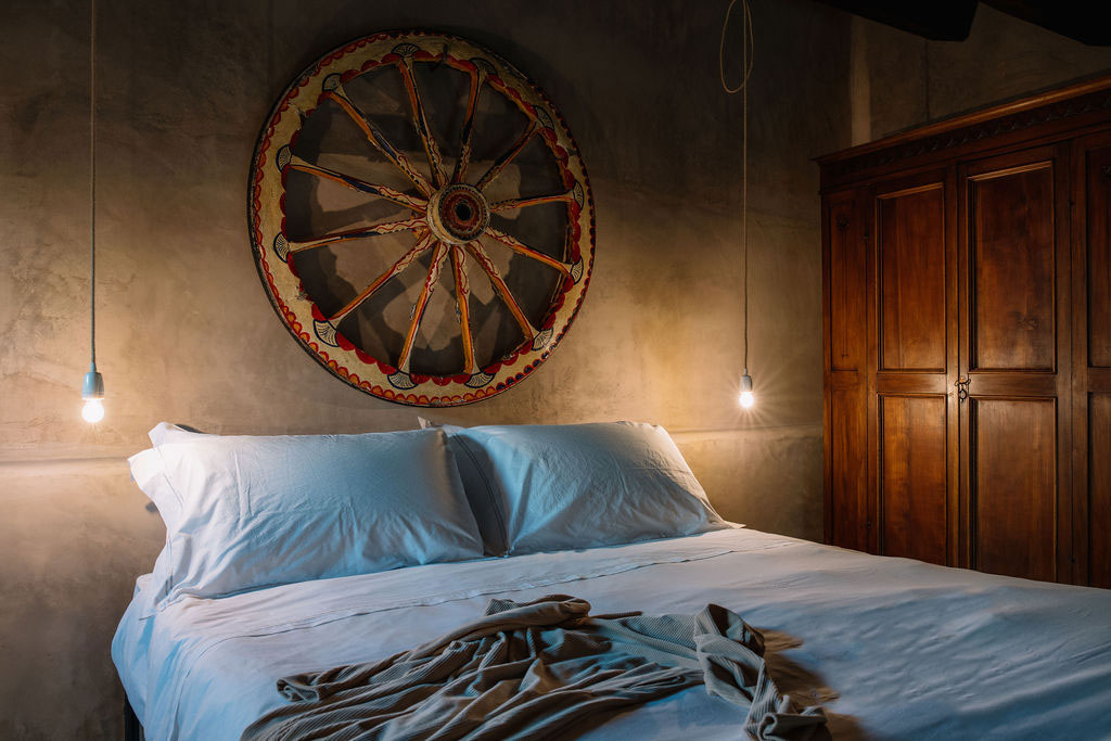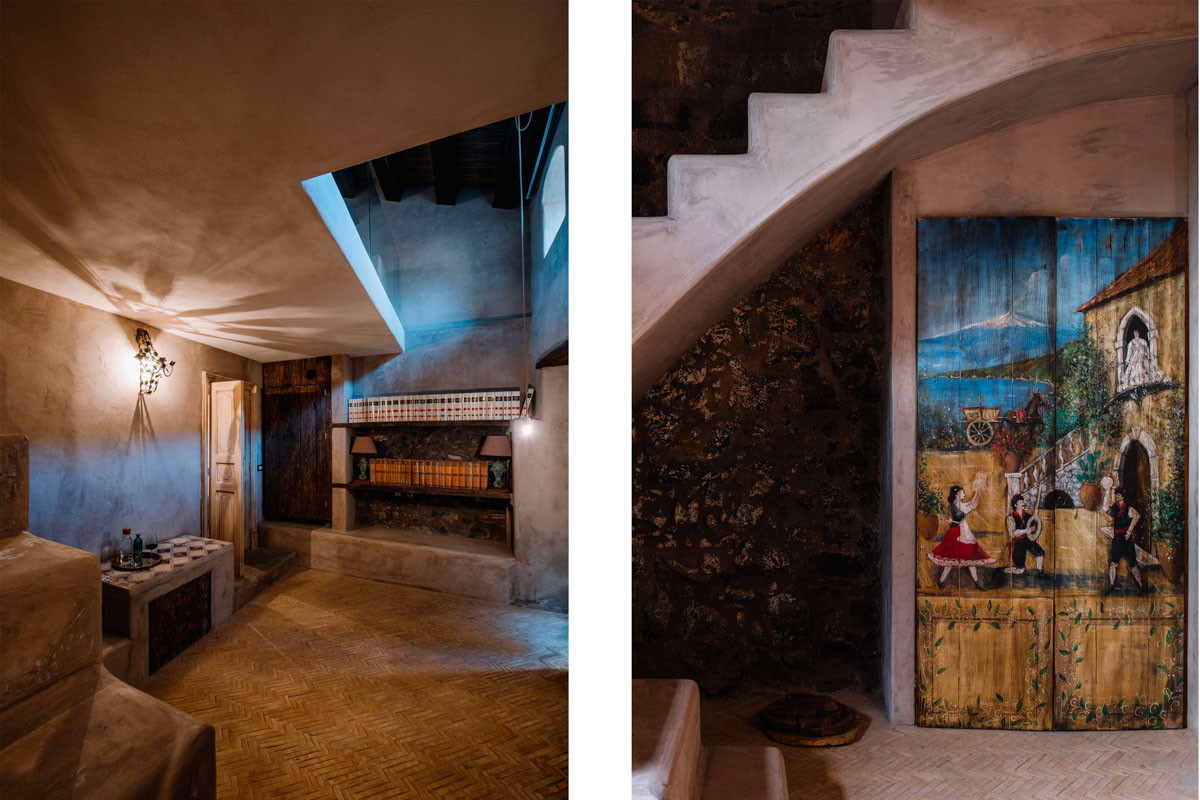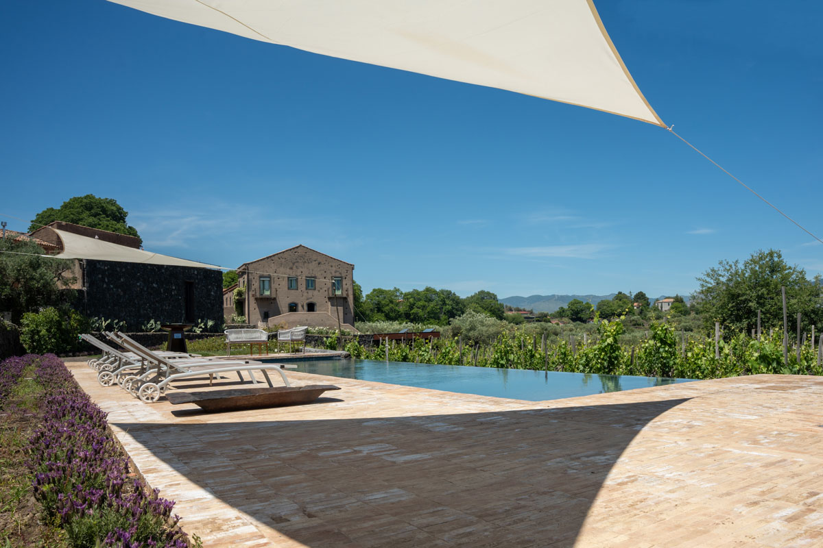 The interiors capture the essence of Sicily through a blend of traditional craftsmanship and contemporary design. Decorative lava stone, wrought iron accents, and intricate lace details adorn the rooms, evoking a warm yet refined atmosphere. Each of the seven bedrooms is uniquely styled to provide an immersive experience, inspired by the estate's winemaking heritage and the timeless allure of the Sicilian landscape. Guests can enjoy modern comforts while surrounded by touches of Sicily’s rich heritage.