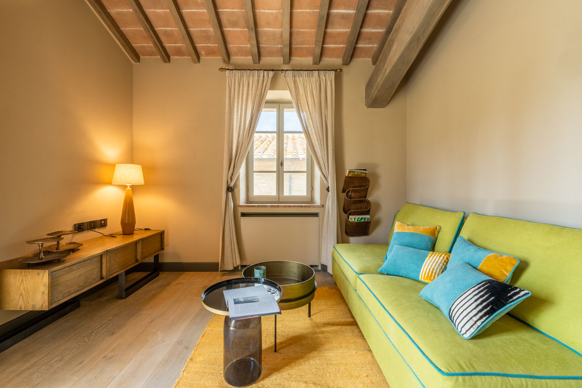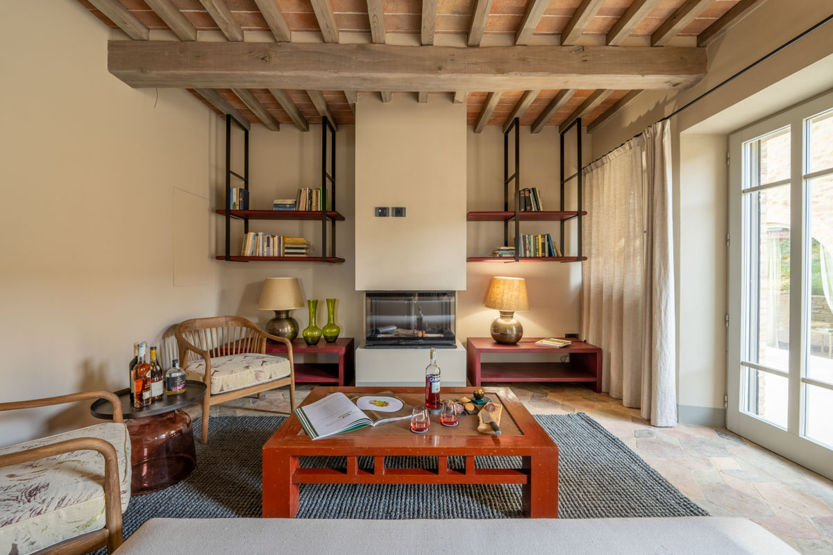 The dépendance features the remaining three double bedrooms. One of them (with a 200x200 bed) has a private entrance, while the other two (one with a 180x200 bed and one with a 200x210 bed) share the same access through a cosy lounge area, from which each of their doors leads into the respective rooms. Each of the rooms has its own en-suite bathroom with a shower. The small lounge area features a one-and-a-half-size sofa bed (ideal for an extra adult or two children), a coffee table, and a couple of armchairs.