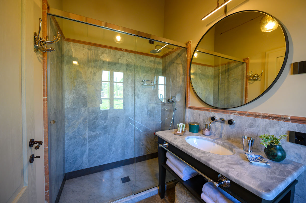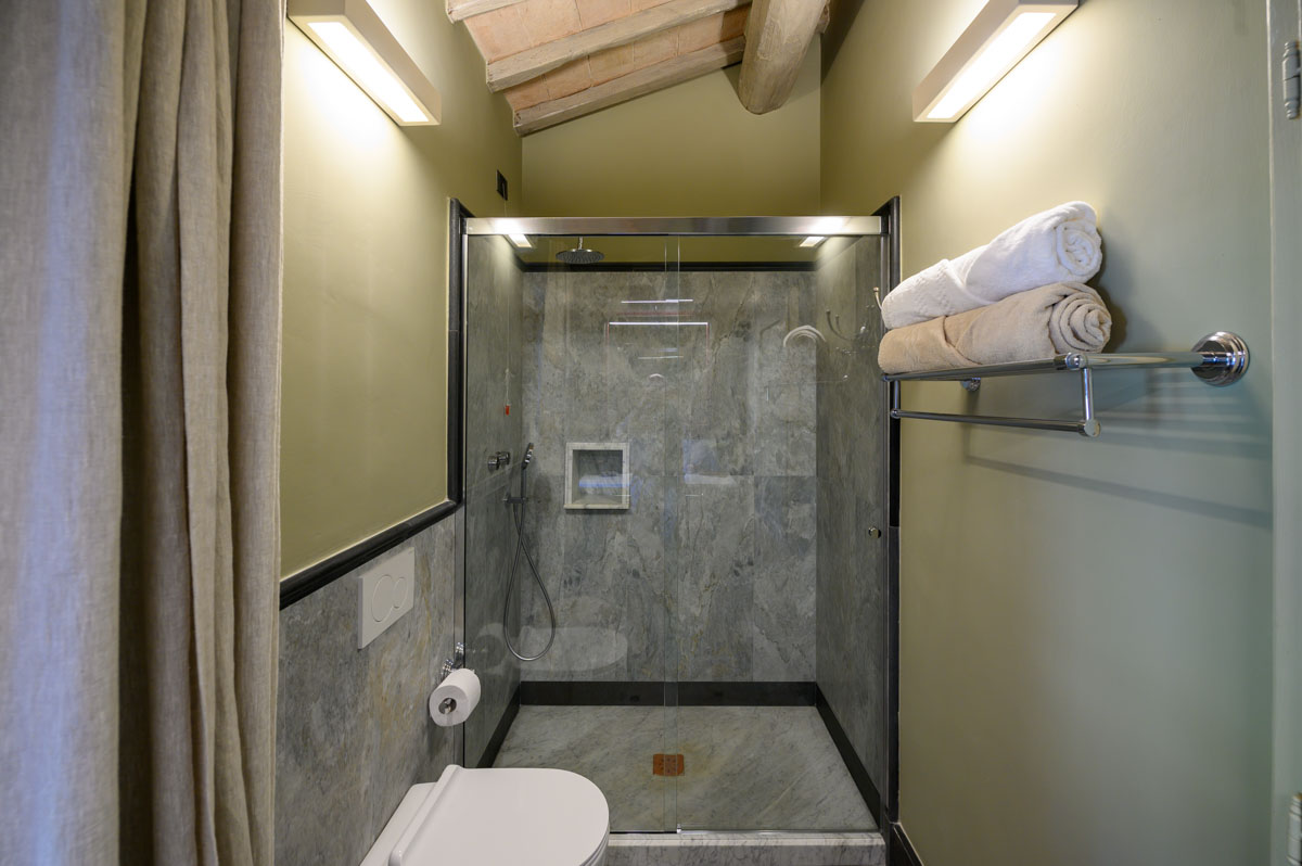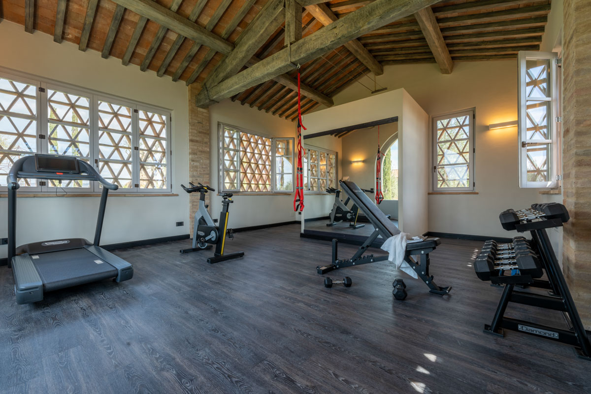 The villa’s grounds also include an outdoor kitchen with a grill and wood-burning oven, ideal for preparing authentic Italian meals. In addition, the thriving olive grove on the property offers the opportunity to experience the beauty of Italy's agricultural heritage. With external access, there is a small dépendance that houses a fully equipped gym, featuring a stationary bike, a weight bench with a variety of free weights, and a treadmill, offering everything needed for a rewarding workout experience.