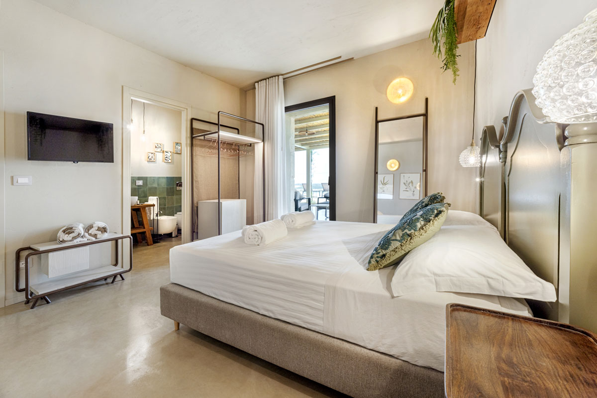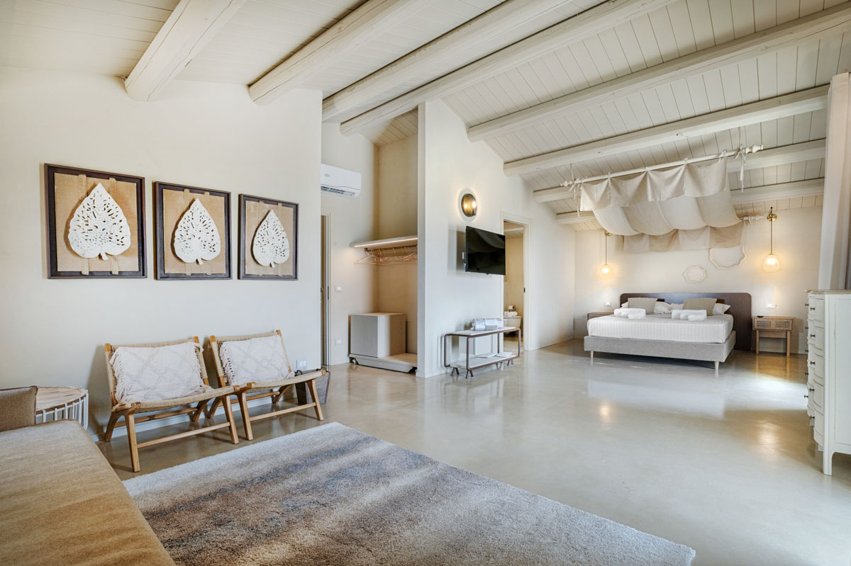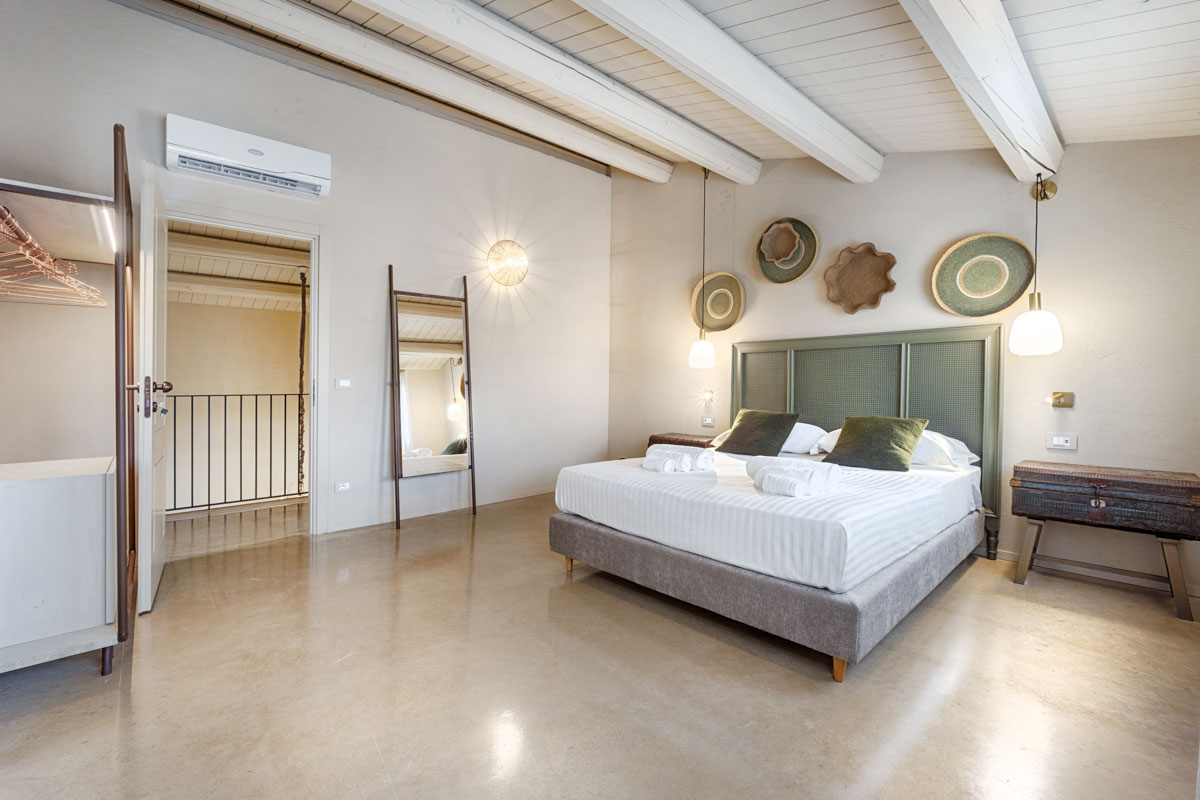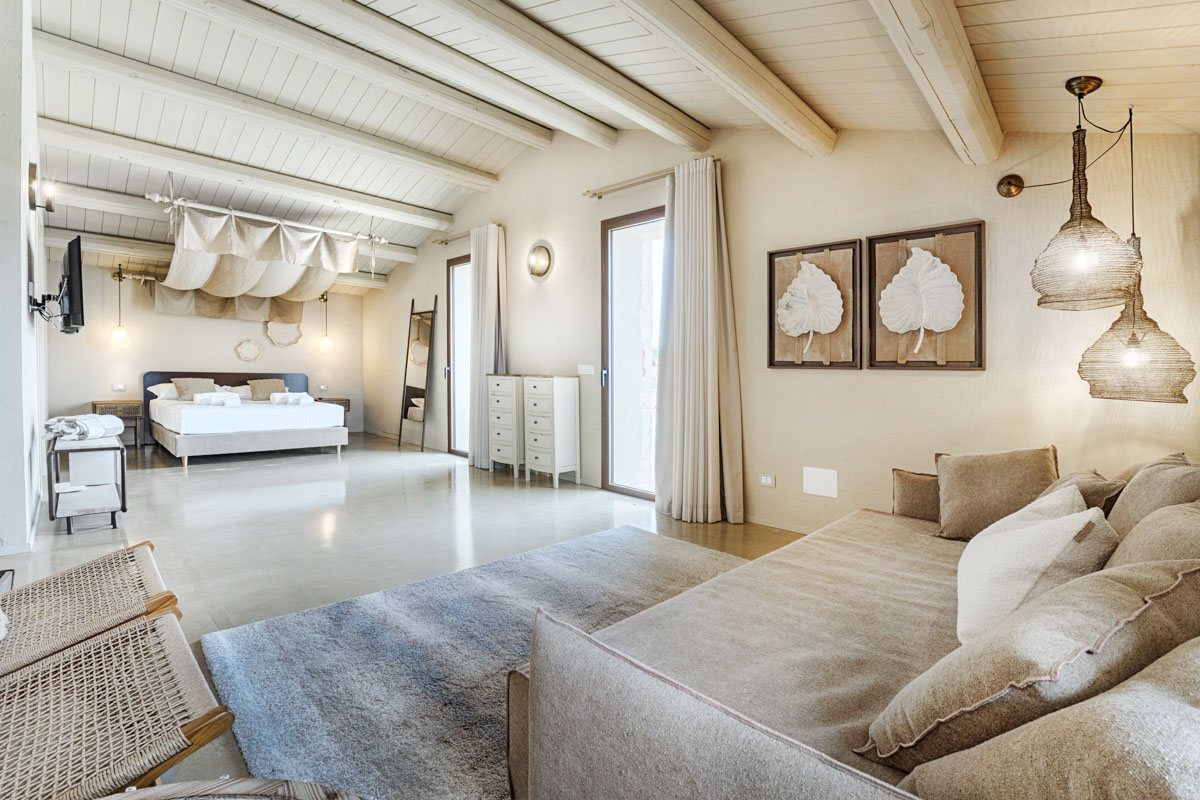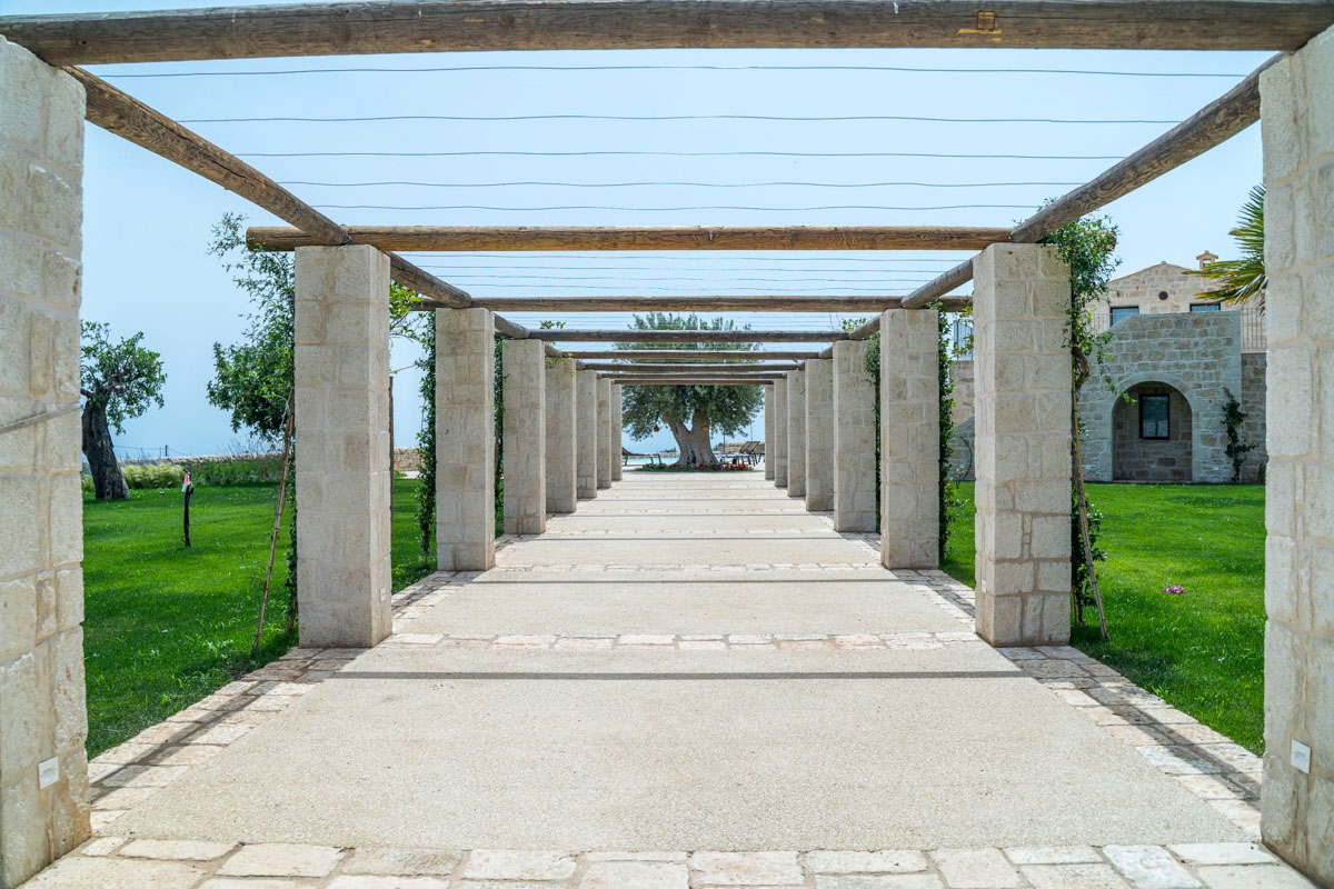 A driveway lined with columns leads through the entrance gates to the swimming pool (18 x 5.5 m, depth 1.40 m). Around the pool, a spacious sunbathing area with loungers and parasols invites guests to unwind, while the beach-style entrance is perfect for a gentle dip. Overlooking the pool and garden, a 100-sqm covered veranda provides a spot for outdoor dining or simply enjoying the view. Nearby, a barbecue area and electric car charging point add extra convenience for easygoing days and warm Sicilian evenings.