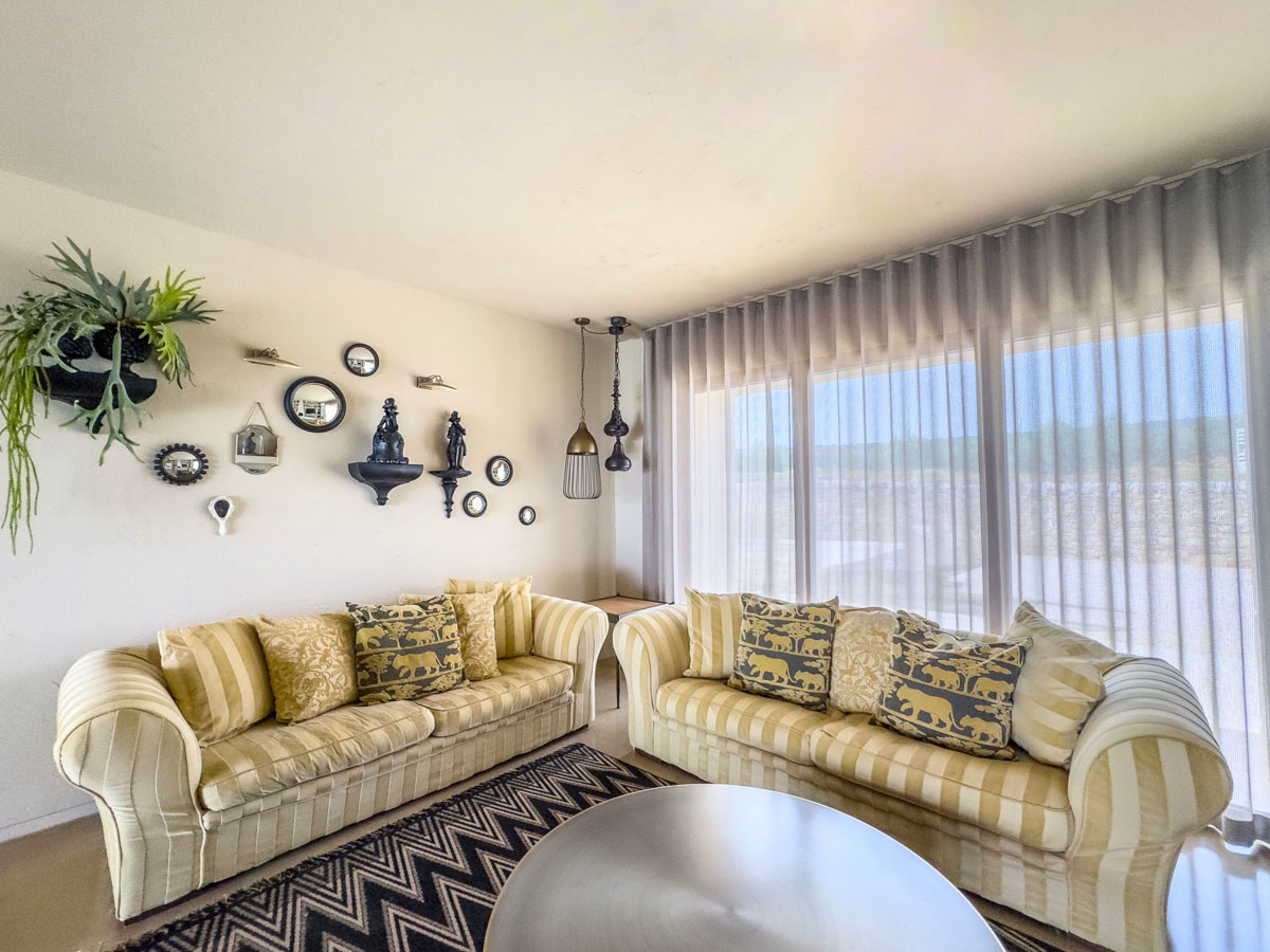 The veranda includes three large dining tables and a cosy sitting area. A glass door connects it to the main living room, while a separate entrance leads into the fully equipped kitchen. The villa is spread over two floors, with six bedrooms on the ground floor and four upstairs, where white wooden ceilings create an airy atmosphere. Inside, soft neutral tones, quality fabrics and textured rugs add warmth. The open-plan living area features an L-shaped sofa, an extendable dining table and a modern kitchen.