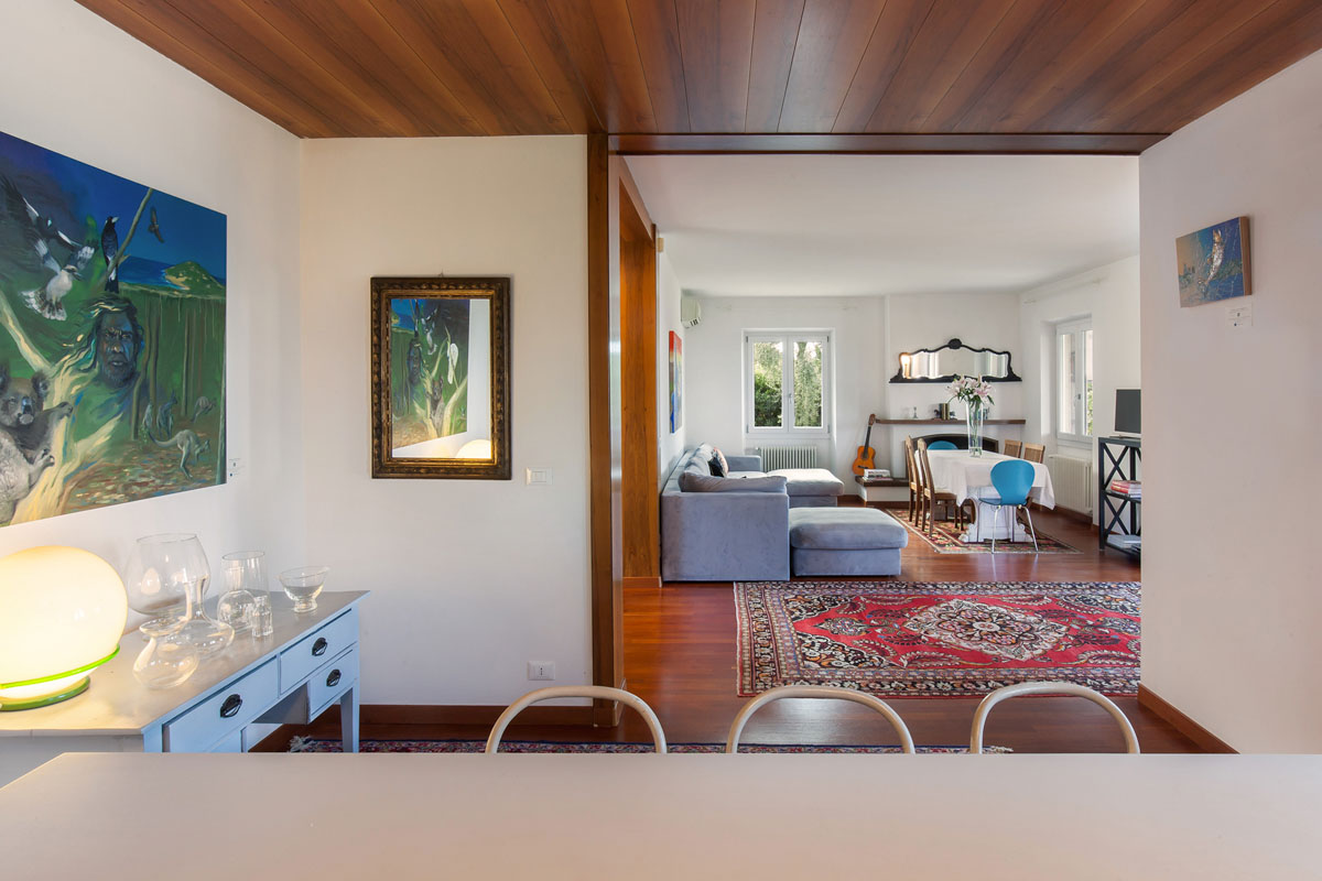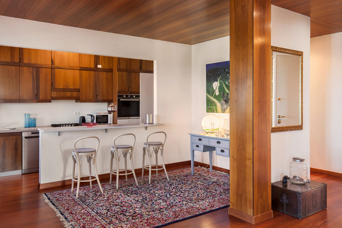 Step inside the villa through a welcoming entrance, where elegant parquet flooring extends throughout the villa, creating a warm and sophisticated atmosphere. The open-plan living and dining room forms the heart of the home, featuring a comfortable sofa and a charming fireplace, perfect for cosy evenings with family or friends. From this space, there is direct access to the fully equipped kitchen, separated by a long peninsula with stylish stools, offering both functionality and a casual spot for social dining.
