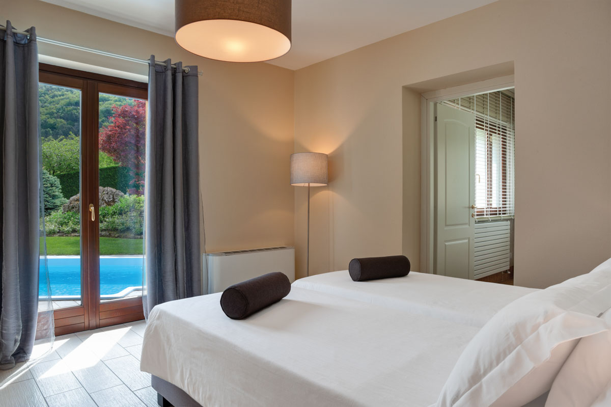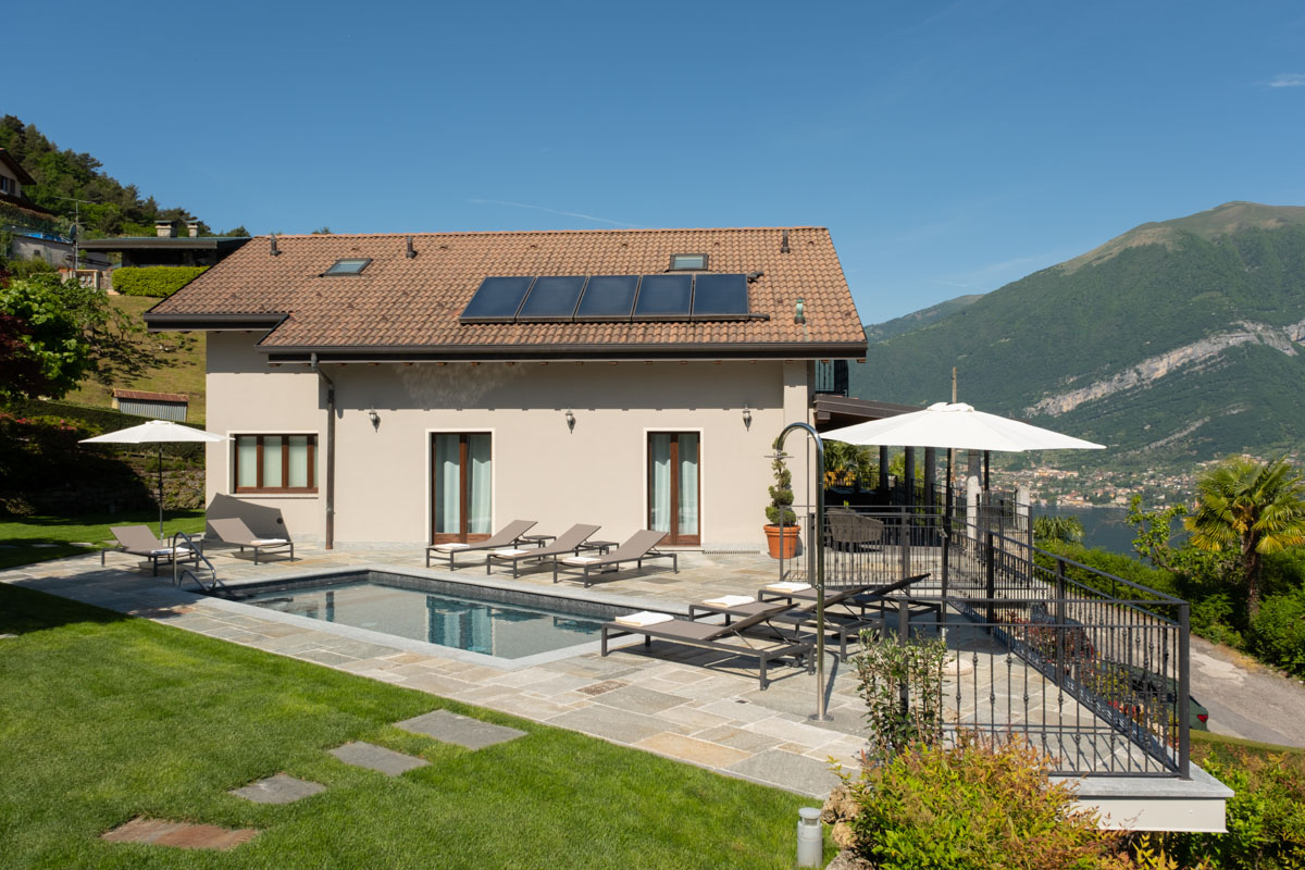 Offering breathtaking views of the lake, the villa features a swimming pool with counter-current swimming option (9 x 3.8 m) and a generous poolside area furnished with comfortable sun loungers, inviting guests to sit back and unwind. With a serene atmosphere, the outdoor area is surrounded by perfectly manicured gardens, featuring al fresco lounge areas for relaxing and socialising. On request, the pool can be heated on request using solar panels (pool heating not included).