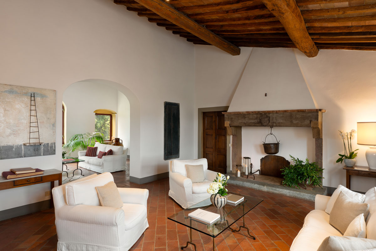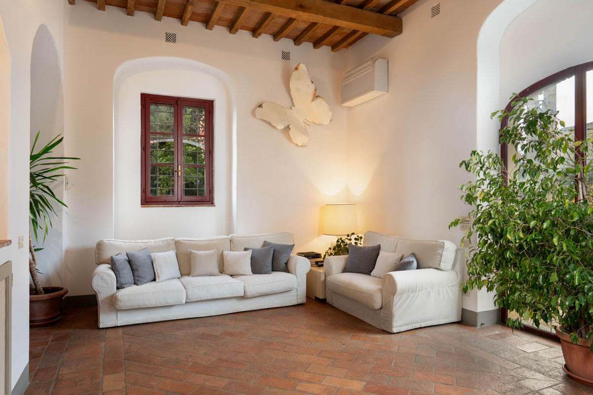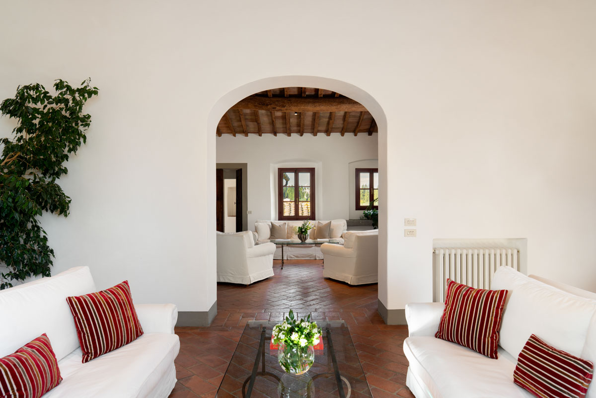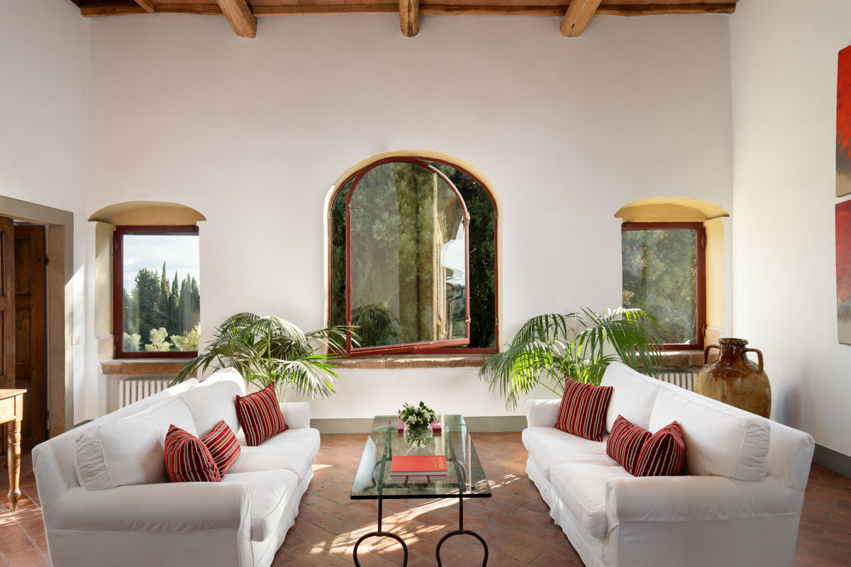 Living Rooms. The villa has two large and bright living rooms on the upper floor where you can spend pleasant moments of total relaxation, surrounded by the tranquility of the landscape and illuminated by the warm rays of the sun. The living rooms are furnished with comfortable sofas and armchairs and through the arched windows you can glimpse the access road to the villa with its tall cypress trees. In one of the living rooms there is a magnificent stone fireplace.