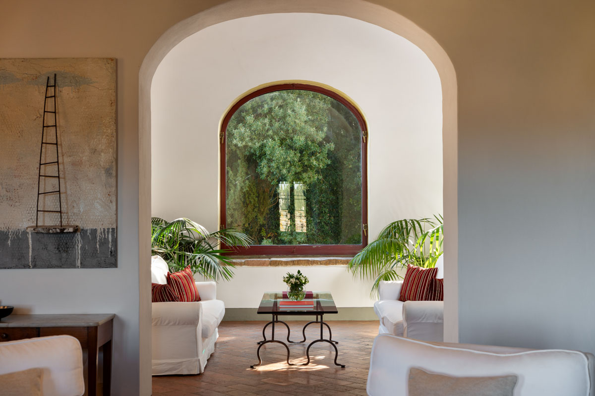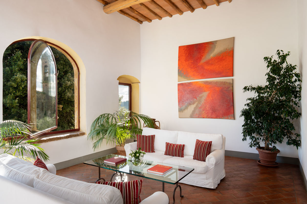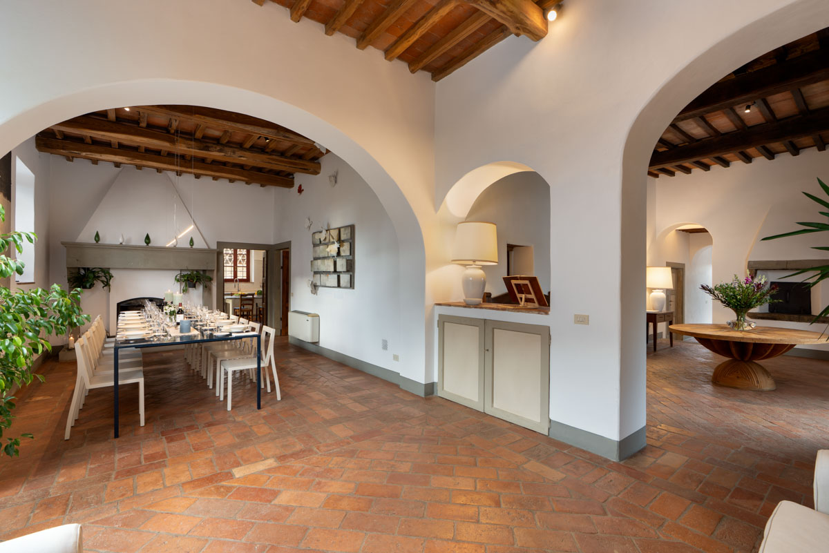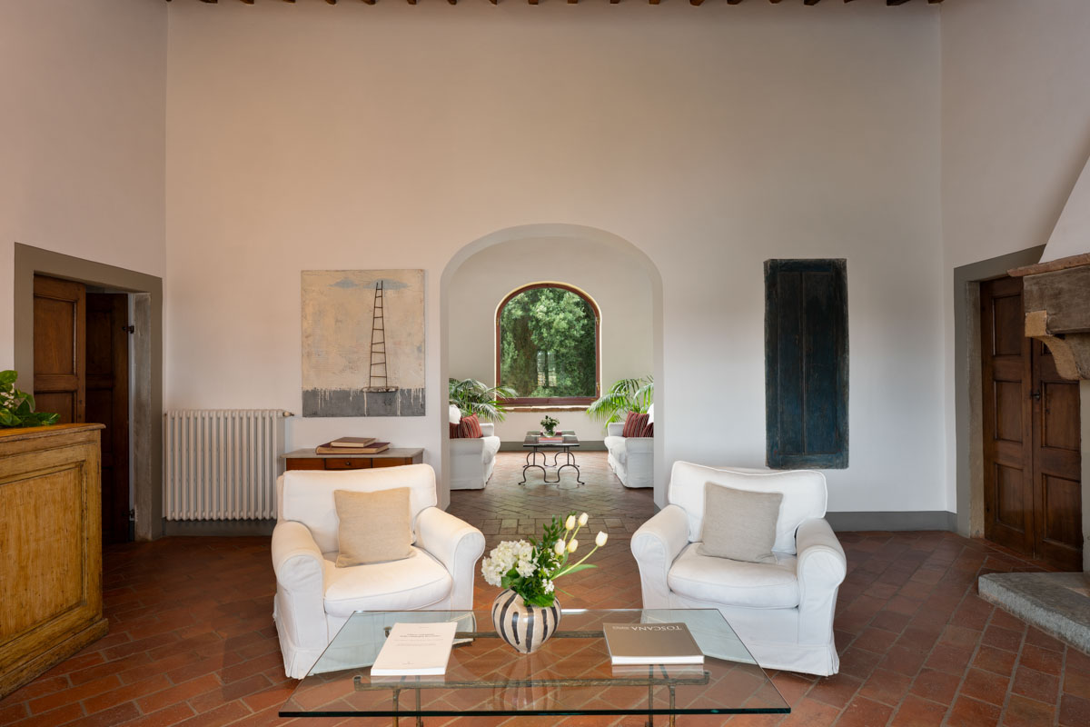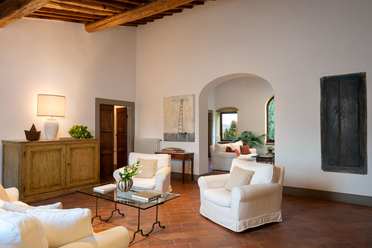 Living Rooms. The villa has two large and bright living rooms on the upper floor where you can spend pleasant moments of total relaxation, surrounded by the tranquility of the landscape and illuminated by the warm rays of the sun. The living rooms are furnished with comfortable sofas and armchairs and through the arched windows you can glimpse the access road to the villa with its tall cypress trees. In one of the living rooms there is a magnificent stone fireplace.