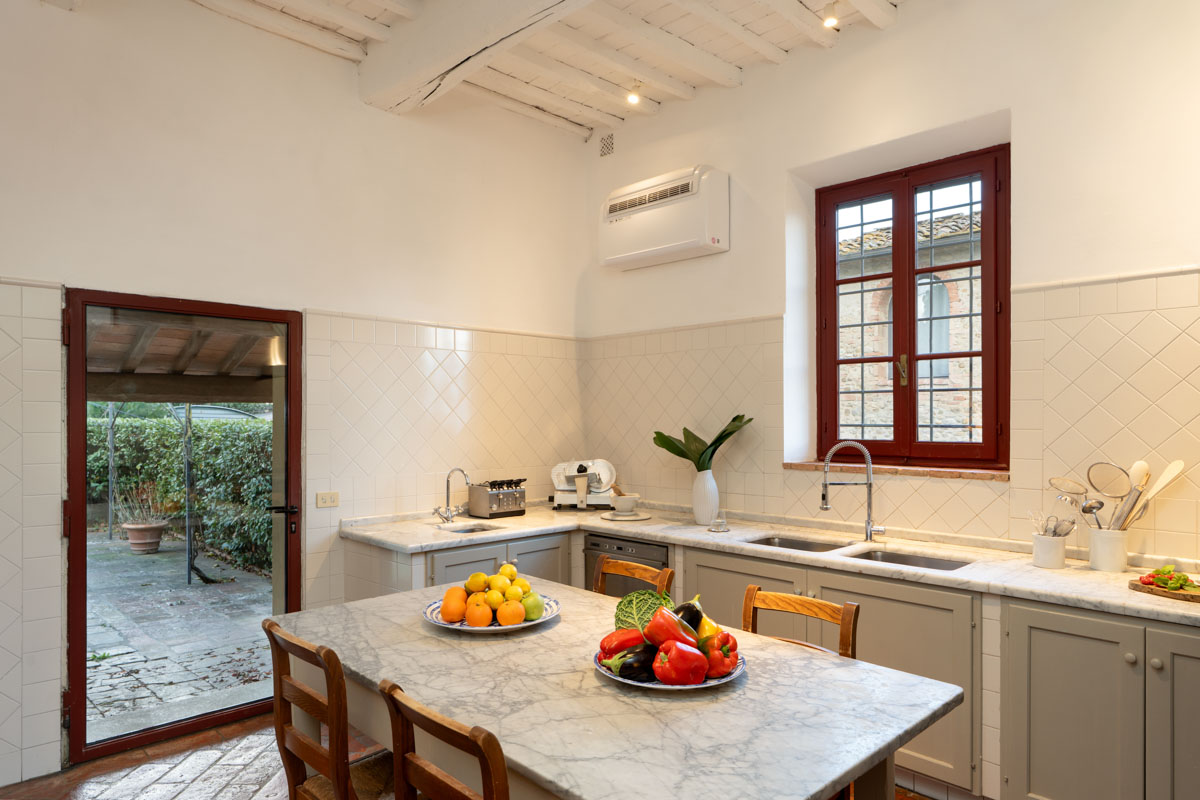 Dining Room and Kitchen. The large dining room in the villa is the ideal place for enjoying the typical dishes of the region. There is, in fact, a large table perfect for lunches or dinners, but also for an afternoon snack. The furnishings of the dining room boast an antique style characterized by sideboards and antique wooden cupboards. In the summer period you can comfortably eat outside the villa: you can use the large gazebo in the courtyard which has a large dining table. The kitchen is equipped with professional stoves, an industrial dishwasher, double refrigerator and a marble-topped table.