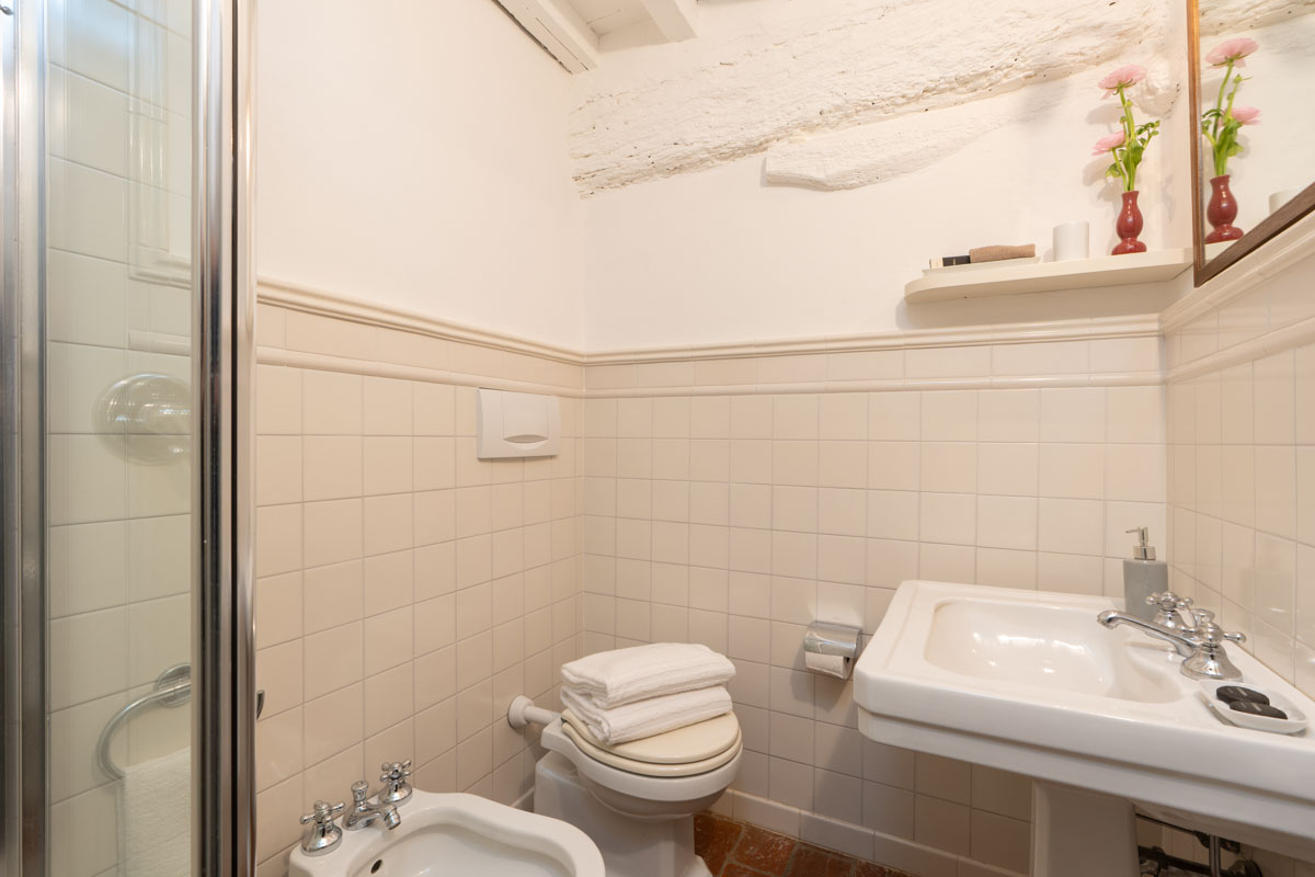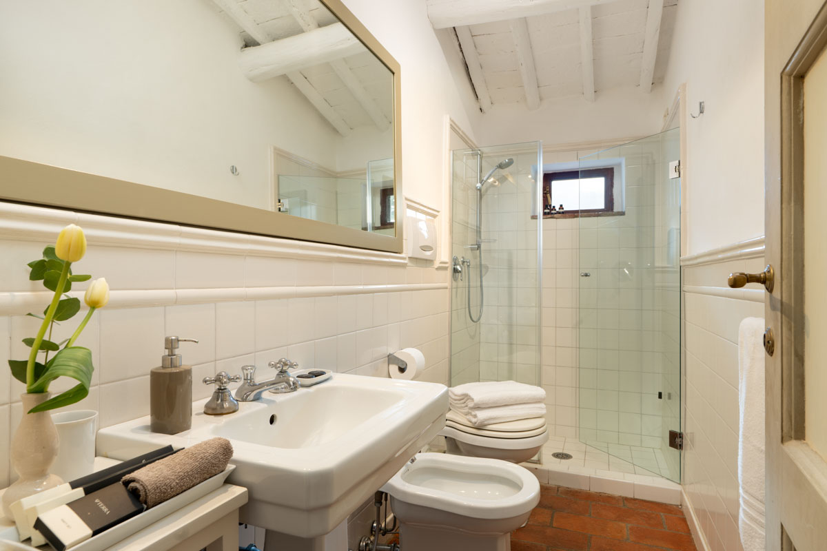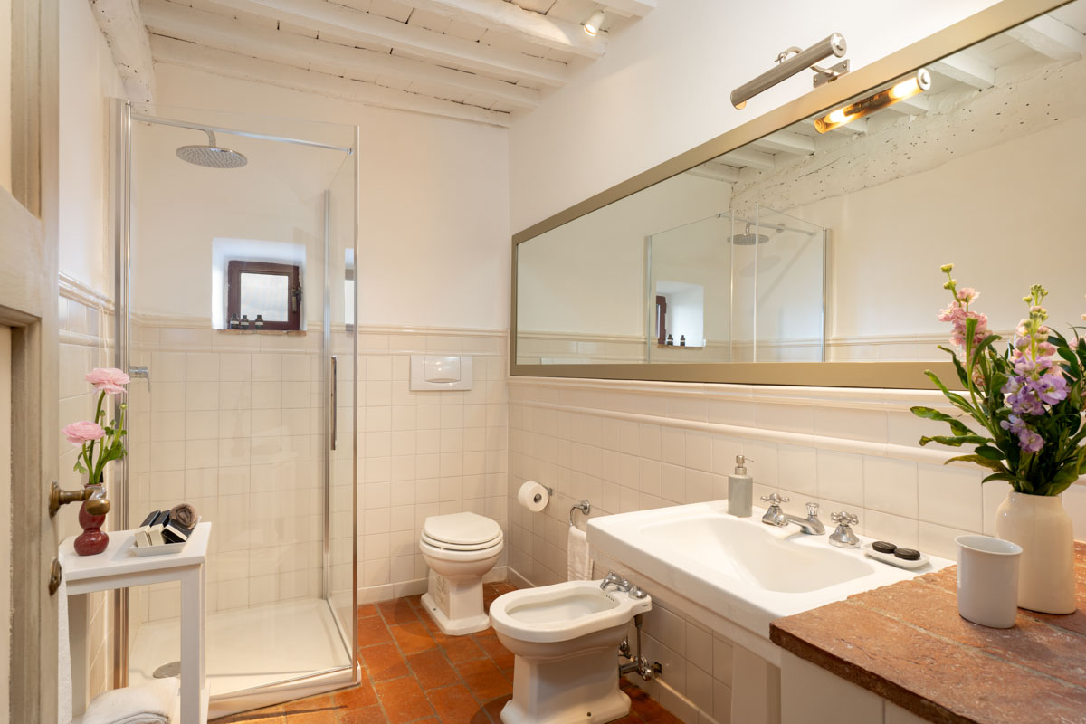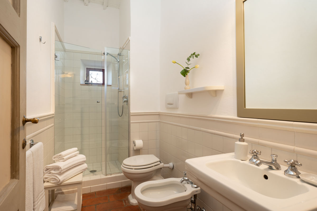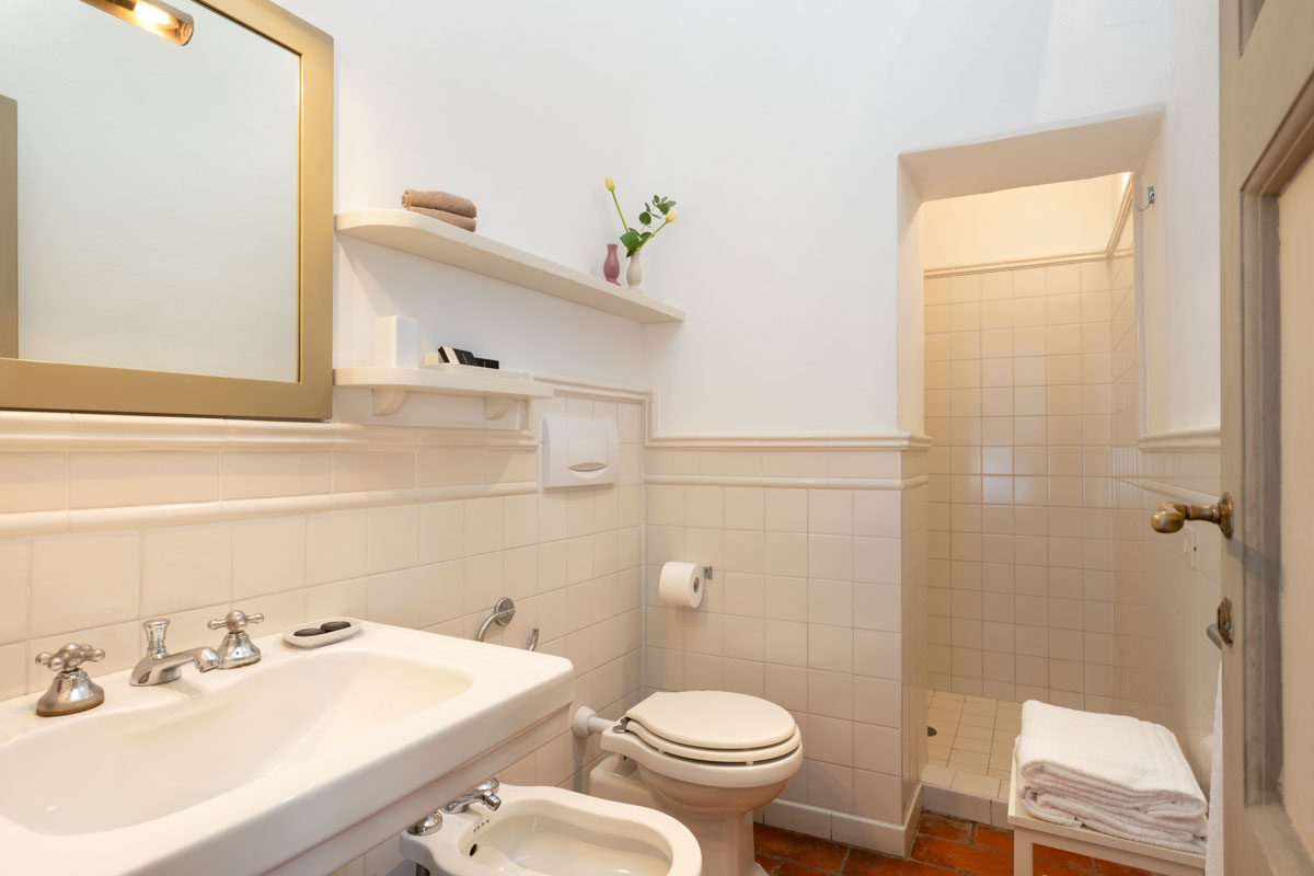 Bedrooms. On the ground floor,a few steps lead to two bedrooms (which can be twin rooms or double bedrooms) with en-suite bathroom. One bathroom has bathtub with shower, while the other one has shower only. On the first floor you will find three bedrooms (which can be twin rooms or double bedrooms) with en-suite bathroom with shower. On the first floor you will also find a double bedroom with en-suite bathroom with shower. On the first floor you will find a single room with en-suite bathroom with shower. In this single room, an extra single bed can be added on request (and at no additional cost).